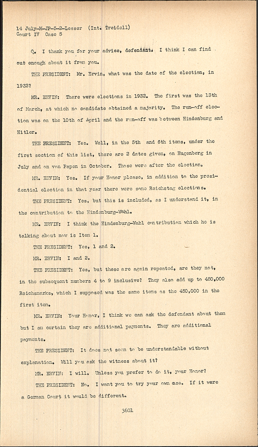 MR. ERVIN:There were elections in 1932. The first was the 13th of March, at which no candidate obtained a majority. The run-off election was on the 10th of April and the run-off was between Hindenburg and Hitler.