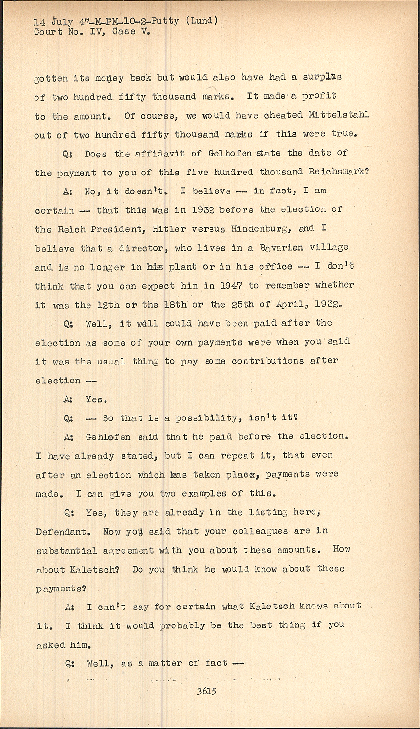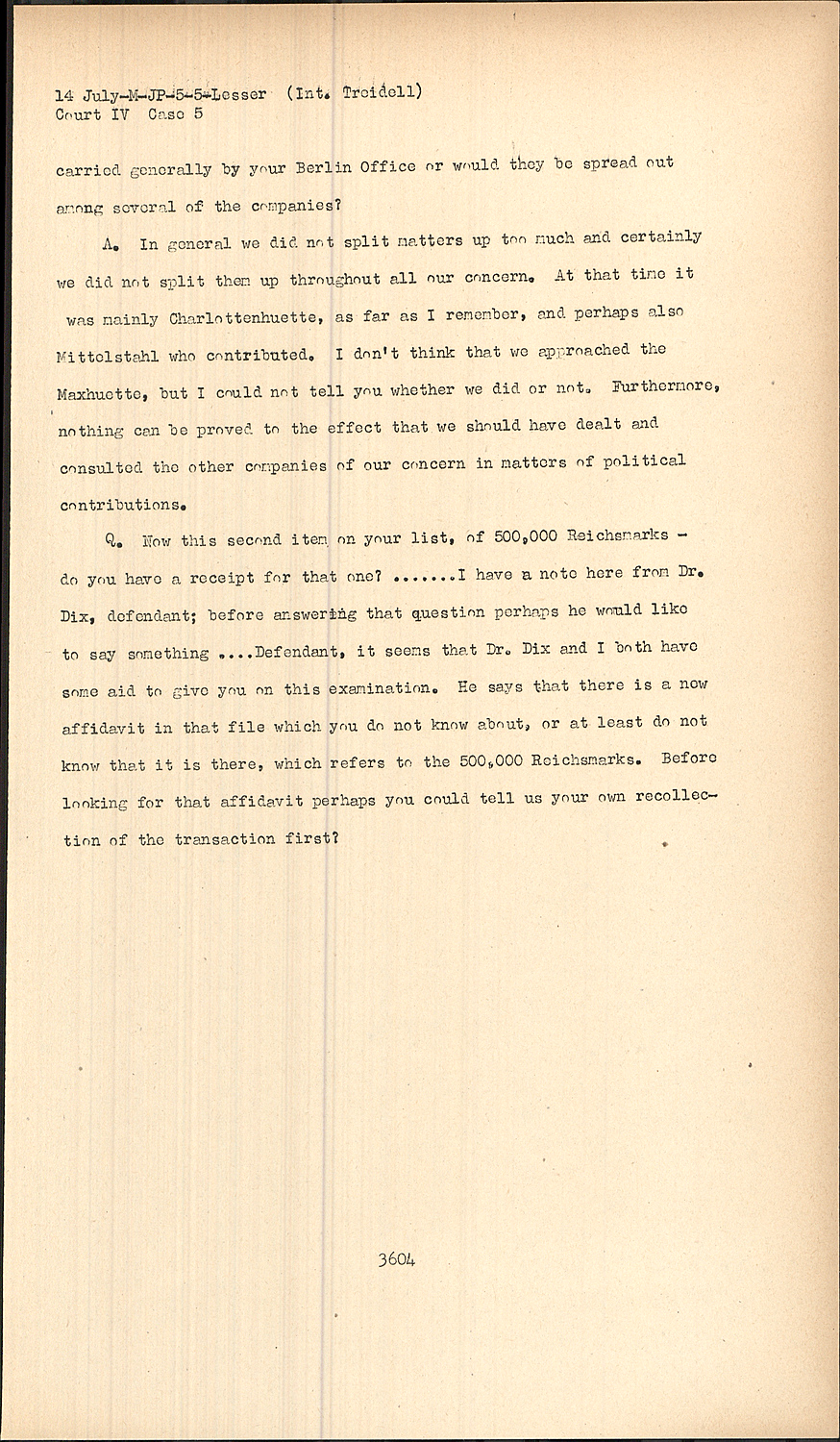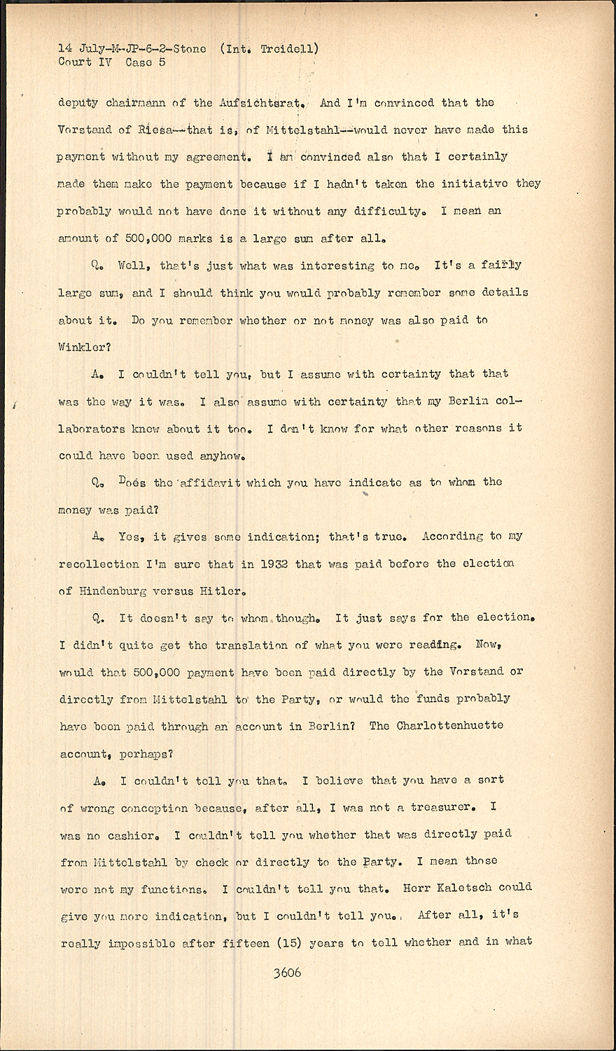 Q.It doesn't say to whom though. It just says for the election. I didn't quite get the translation of what you were reading. How, would that 500,000 payment have been paid directly by the Vorstand or directly from Mittelstahl to the Party, or would the funds probably have been paid through an account in Berlin? The Charlottenhuette account, perhaps?