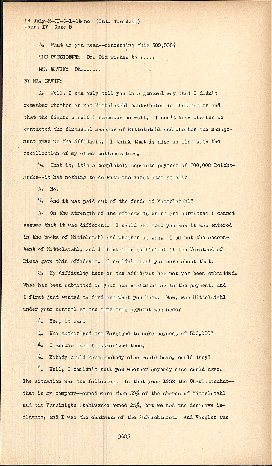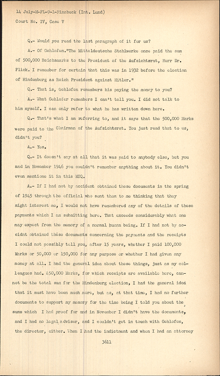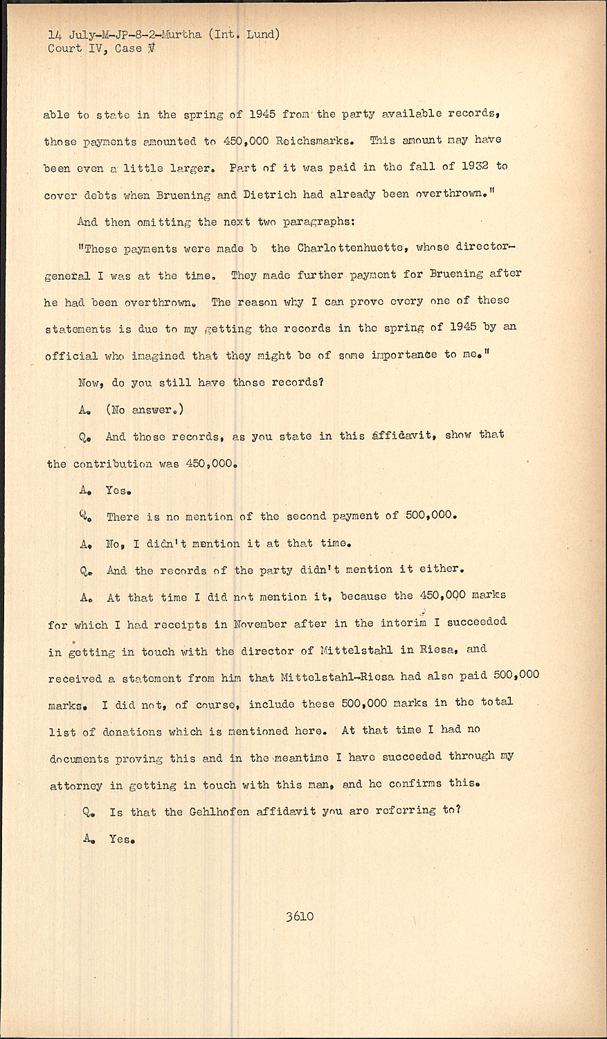 A.Well, I can only tell you in a general way that I didn't remember whether or not Mittelstahl contributed in that matter and that the figure itself I remember so well. I don't know whether we contacted the financial manager of Mittelstahl and whether the management gave us the affidavit. I think that is also in line with the recollection of my other collaborators.