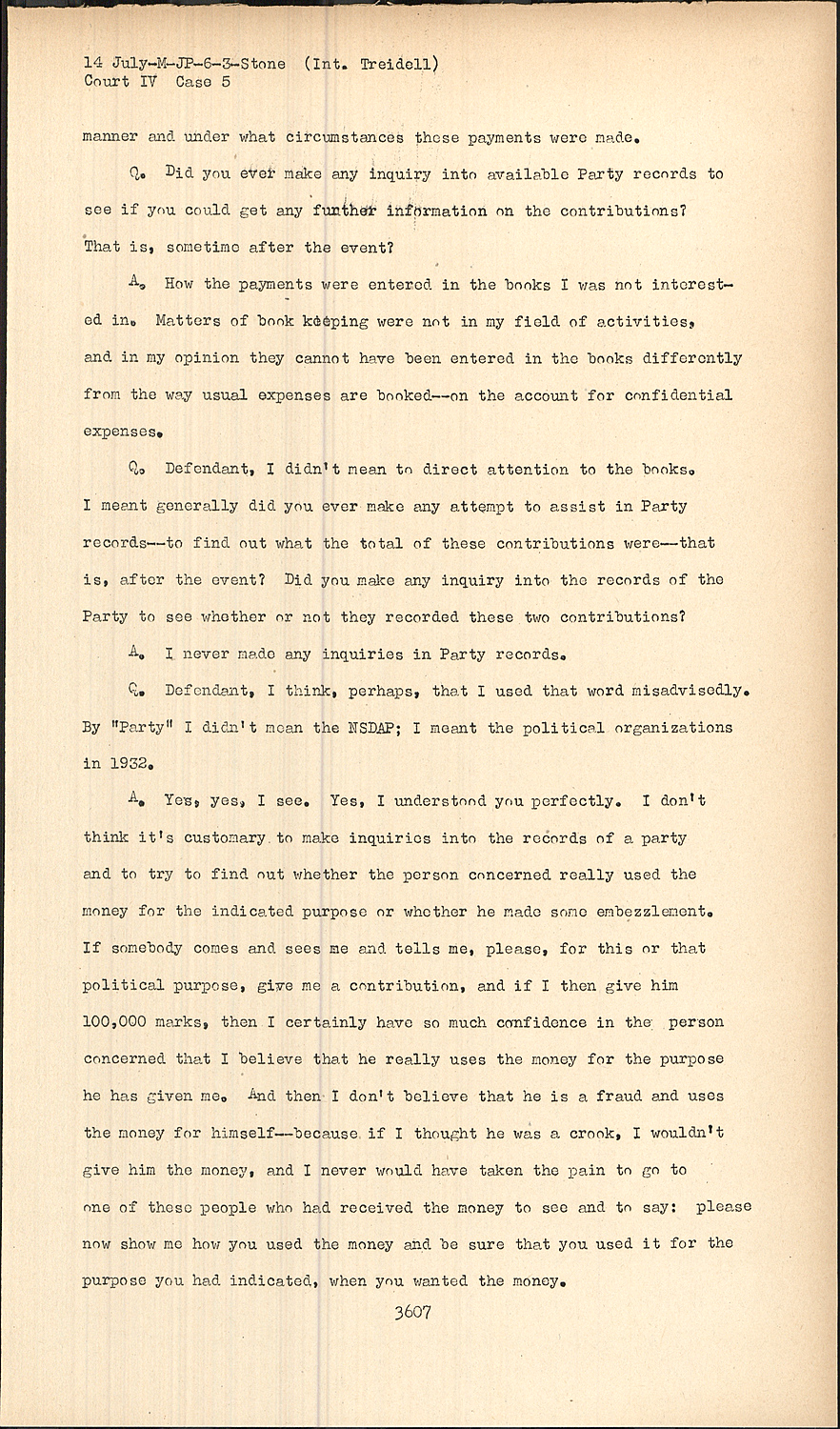 A.Yes, yes, I see. Yes, I understood you perfectly. I don't think it's customary to make inquiries into the records of a party and to try to find out whether the person concerned really used the money for the indicated purpose or whether he made some embezzlement. If somebody comes and sees me and tells me, please, for this or that political purpose, give me a contribution, and if I then give him 100,000 marks, then I certainly have so much confidence in the person concerned that I believe that he really uses the money for the purpose he has given me. And then I don't believe that he is a fraud and uses the money for himself--because if I thought he was a crook, I wouldn't give him the money, and I never would have taken the pain to go to one of these people who had received the money to see and to say: please now show me how you used the money and be sure that you used it for the purpose you had indicated, when you wanted the money.
