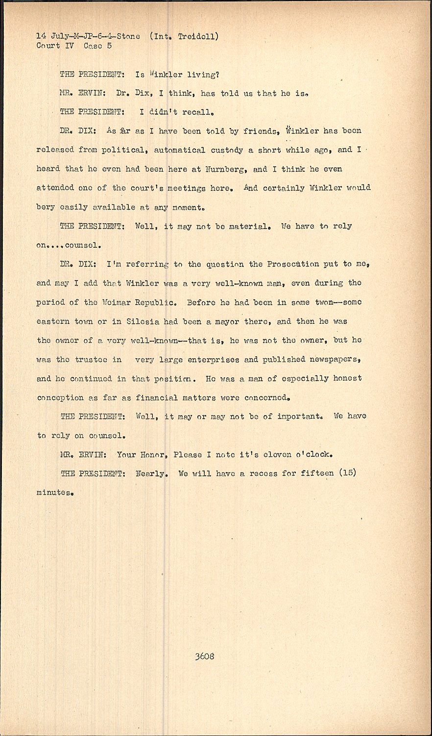 DR. DIX:As far as I have been told by friends, Winkler has been released from political, automatical custody a short while ago, and I heard that he even had been here at Nurnberg, and I think he even attended one of the court's meetings here. And certainly Winkler would bery easily available at any moment.