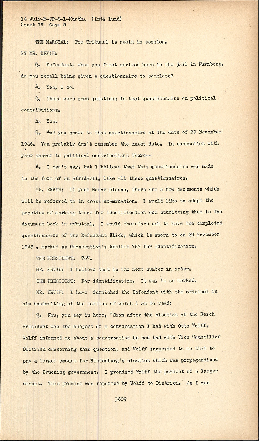MR. ERVIN:If your Honor please, there are a few documents which will be referred to in cross examination. I would like to adopt the practice of marking these for identification and submitting them in the document book in rebuttal. I would therefore ask to have the completed questionnaire of the Defendant Flick, which is sworn to on 29 November 1946, marked as Prosecution's Exhibit 767 for Identification.