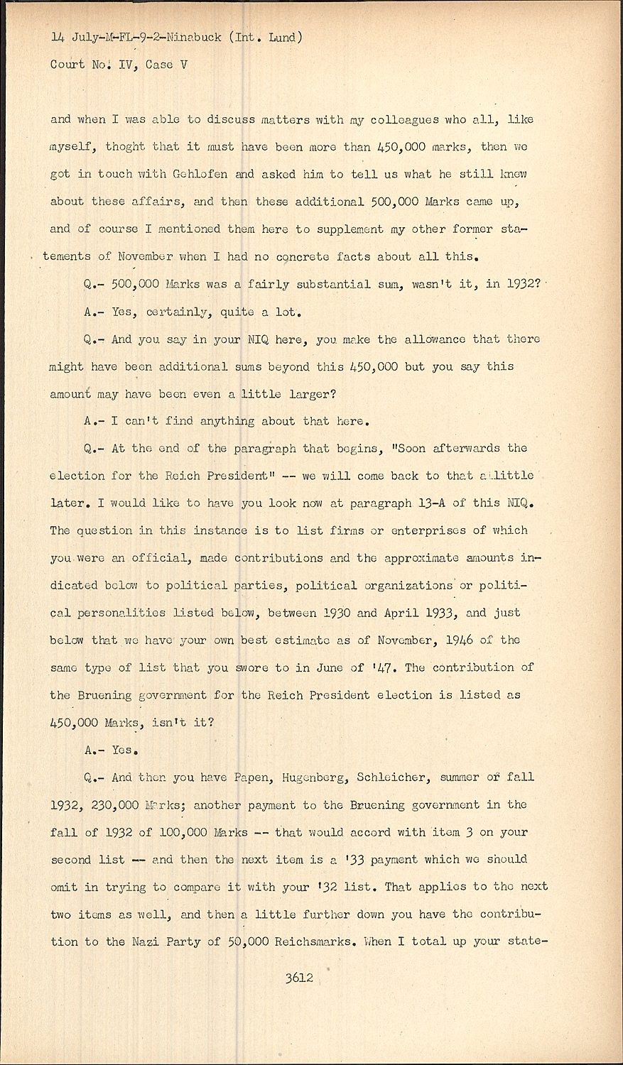 Q.Now, you say in here, "Soon after the election of the Reich President was the subject of a conversation I had with Otto Wolff. Wolff informed me about a conversation he had had with Vice Councillor Dietrich concerning this question, and Wolff suggested to me that to pay a larger amount for Hindenburg's election which was propagandized by the Bruening government. I promised Wolff the payment of a larger amount. This promise was reported by Wolff to Dietrich. As I was able to state in the spring of 1945 from the party available records, those payments amounted to 450,000 Reichsmarks.
