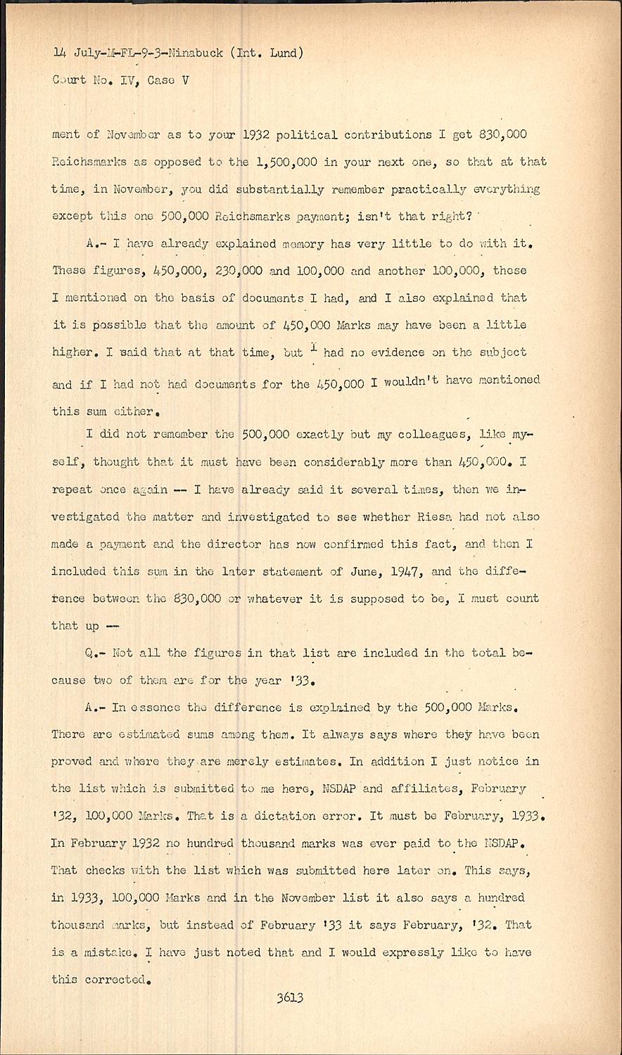 A.- In essence the difference is explained by the 500,000 Marks. There are estimated sums among them. It always says where they have been proved and where they are merely estimates. In addition I just notice in the list which is submitted to me here, NSDAP and affiliates, February '32, 100,000 Marks. That is a dictation error. It must be February, 1933. In February 1932 no hundred thousand marks was ever paid to the NSDAP. That checks with the list which was submitted here later on. This says, in 1933, 100,000 Marks and in the November list it also says a hundred thousand marks, but instead of February '33 it says February, '32. That is a mistake. I have just noted that and I would expressly like to have this corrected.