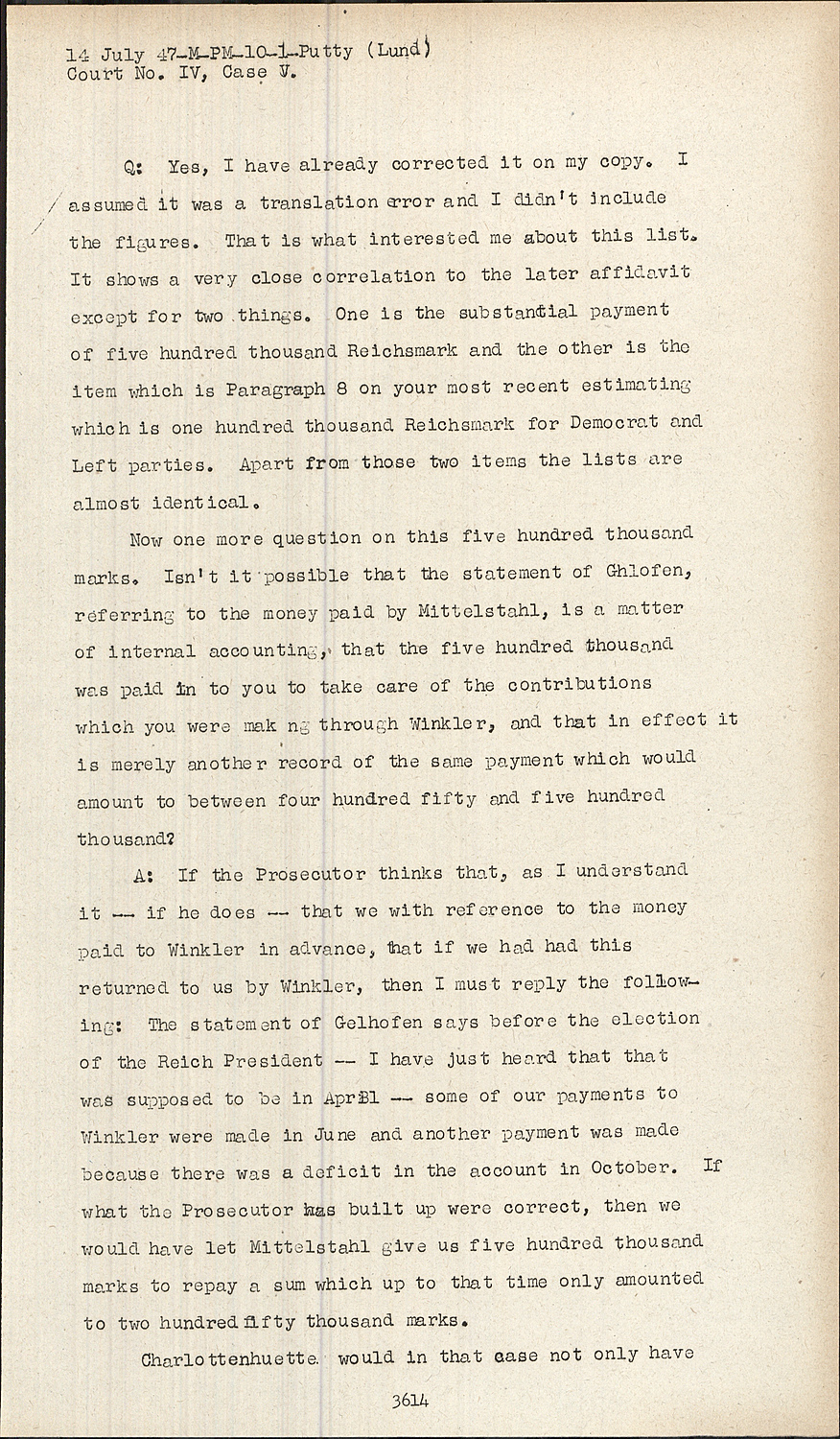 A:If the Prosecutor thinks that, as I understand it -- if he does -- that we with reference to the money paid to Winkler in advance, that if we had had this returned to us by Winkler, then I must reply the following: The statement of Gelhofen says before the election of the Reich President -- I have just heard that that was supposed to be in AprBl -- some of our payments to Winkler were made in June and another payment was made because there was a deficit in the account in October. If what the Prosecutor has built up were correct, then we would have let Mittelstahl give us five hundred thousand marks to repay a sum which up to that time only amounted to two hundredfifty thousand marks.
