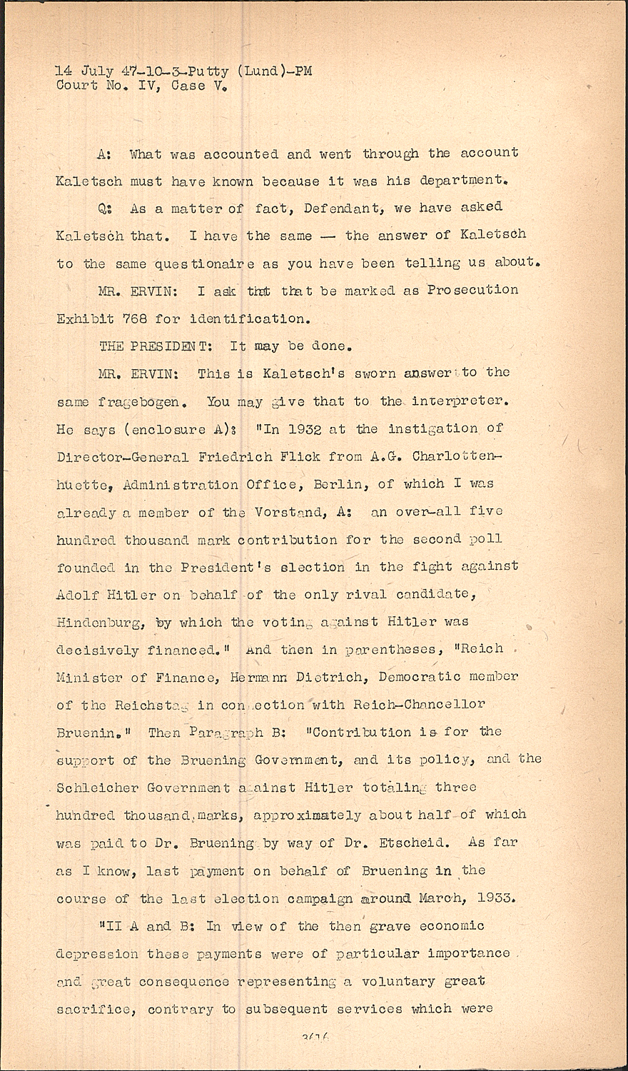 MR. ERVIN:This is Kaletsch's sworn answer to the same fragebogen. You may give that to the interpreter. He says (enclosure A): "In 1932 at the instigation of Director-General Friedrich Flick from A.G. Charlottenhuette, Administration Office, Berlin, of which I was already a member of the Vorstand, A: an over-all five hundred thousand mark contribution for the second poll founded in the President's election in the fight against Adolf Hitler on behalf of the only rival candidate, Hindenburg, by which the voting against Hitler was decisively financed." And then in parentheses, "Reich Minister of Finance, Hermann Dietrich, Democratic member of the Reichstag in connection with Reich--Chancellor Bruenin." Then Paragraph B: "Contribution is for the support of the Bruening Government, and its policy, and the Schleicher Government against Hitler totaling three hundred thousand marks, approximately about half of which was paid to Dr. Bruening by way of Dr. Etscheid. As far as I know, last payment on behalf of Bruening in the course of the last election campaign around March, 1933.