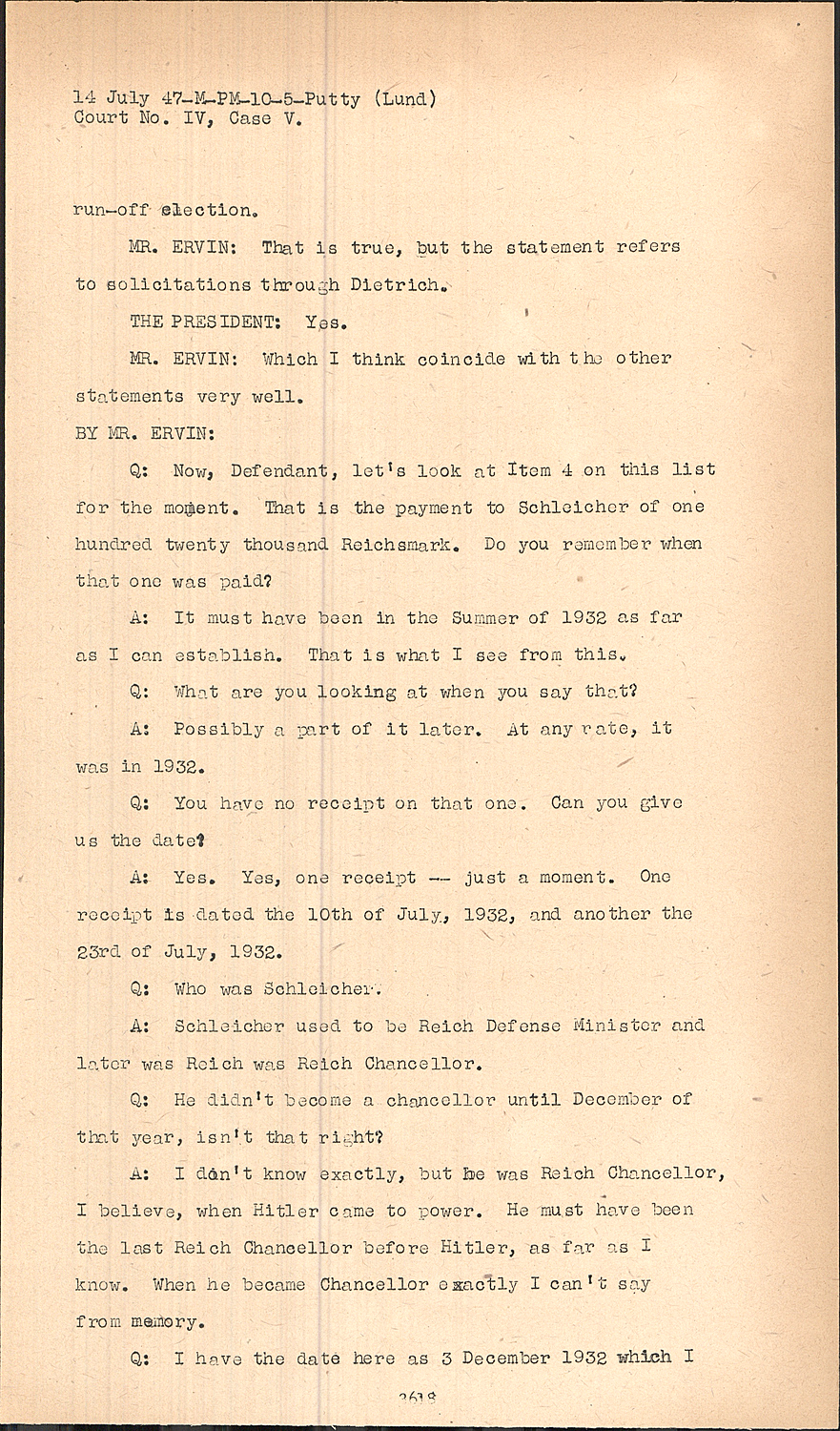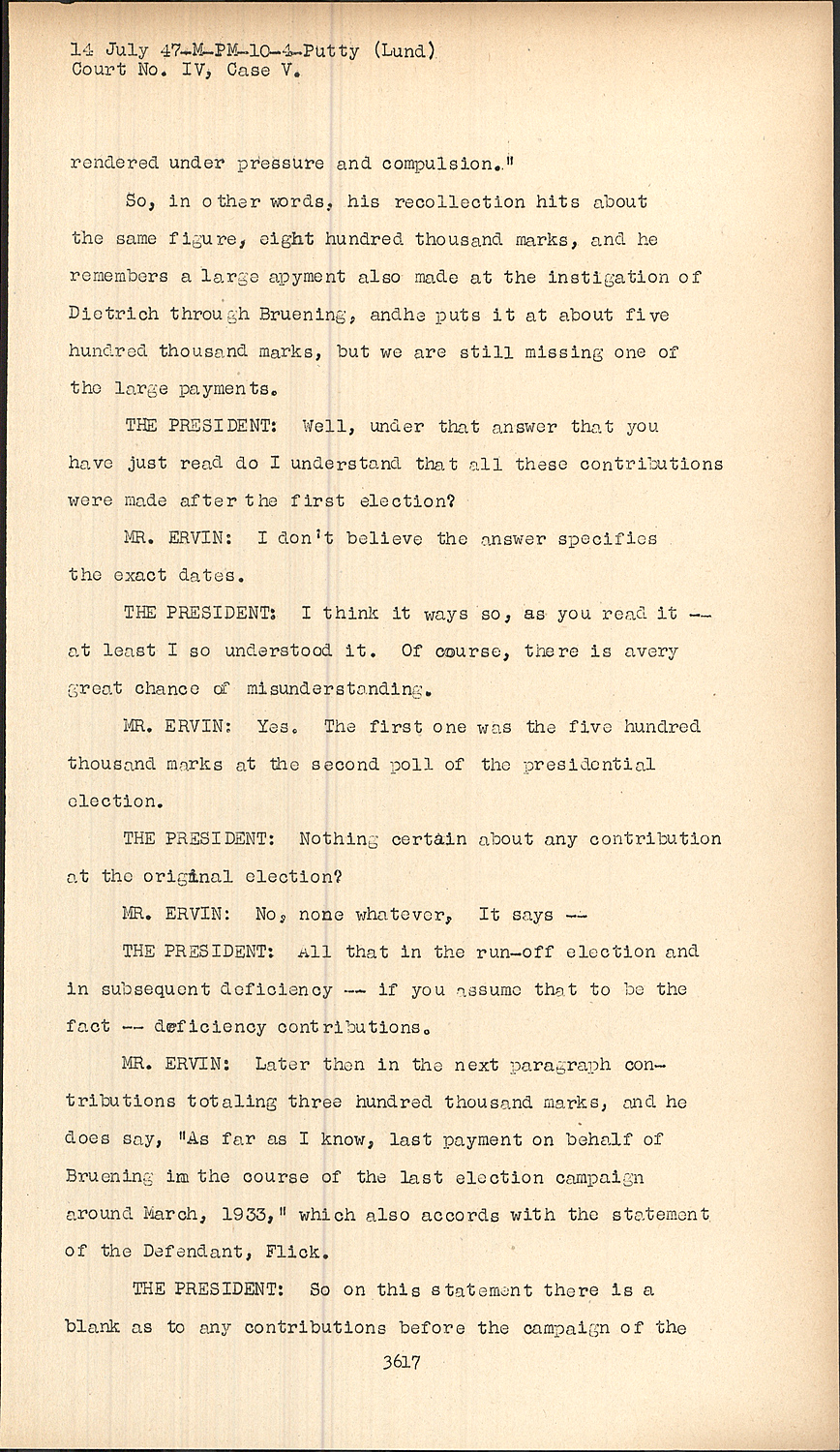 MR. ERVIN:Later then in the next paragraph contributions totaling three hundred thousand marks, and he does say, "As far as I know, last payment on behalf of Bruening in the course of the last election campaign around March, 1933," which also accords with the statement of the Defendant, Flick.