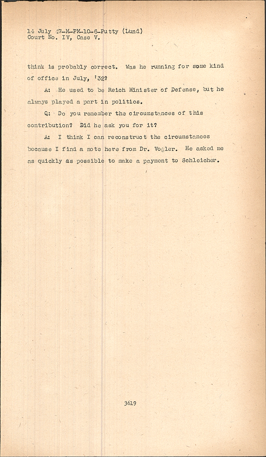 Q.- And then you have Papen, Hugenberg, Schleicher, summer of fall 1932, 230,000 Marks; another payment to the Bruening government in the fall of 1932 of 100,000 Marks -- that would accord with item 3 on your second list -- and then the next item is a '33 payment which we should omit in trying to compare it with your '32 list.