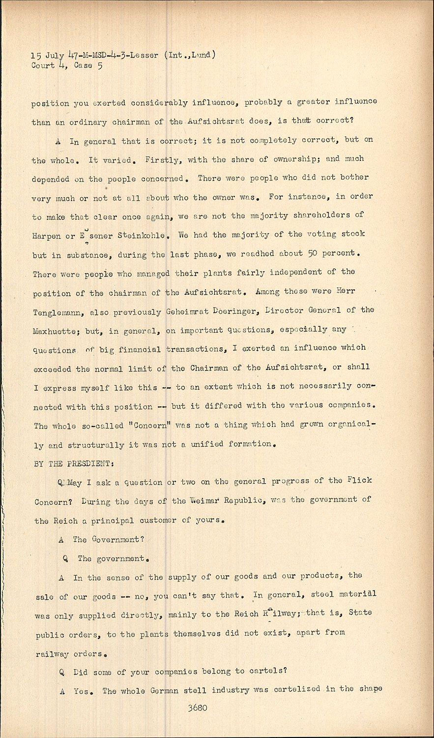 AIn general that is correct; it is not completely correct, but on the whole. It varied. Firstly, with the share of ownership; and much depended on the people concerned. There were people who did not bother very much or not at all about who the owner was. For instance, in order to make that clear once again, we are not the majority shareholders of Harpen or Essener Steinkohle. We had the majority of the voting stock but in substance, during the last phase, we readhed about 50 percent. There were people who managed their plants fairly independent of the position of the chairman of the Aufsichtsrat. Among these were Herr Tenglemann, also previously Geheimrat Doeringer, Director General of the Maxhuette; but, in general, on important questions, especially any questions of big financial transactions, I exerted an influence which exceeded the normal limit of the Chairman of the Aufsichtsrat, or shall I express myself like this -- to an extent which is not necessarily connected with this position -- but it differed with the various companies. The whole so-called "Concern" was not a thing which had grown organically and structurally it was not a unified formation. BY THE PRESDIENT: