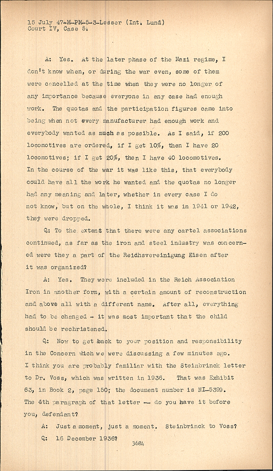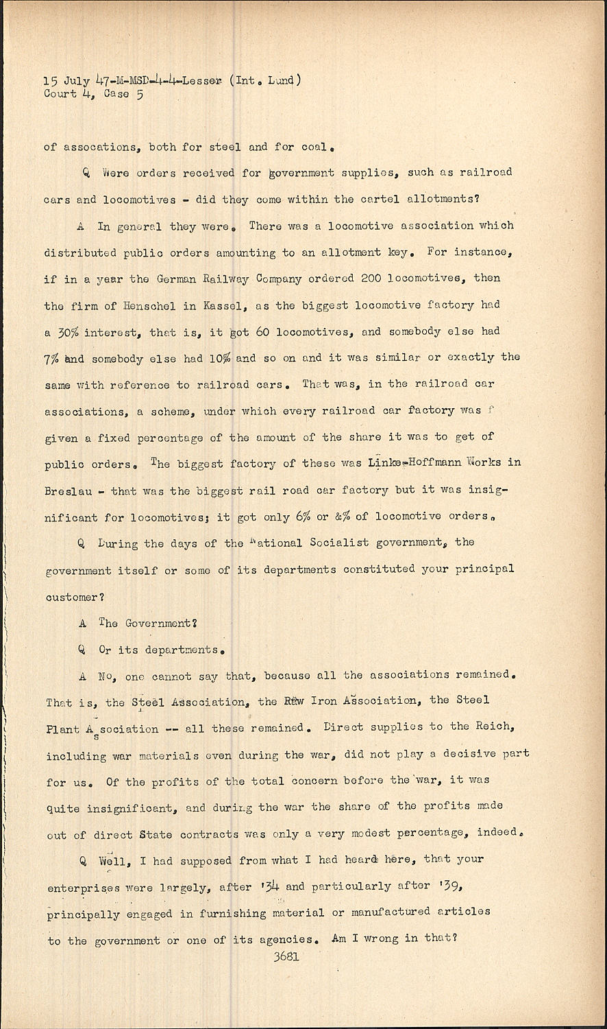 A:Yes. At the later phase of the Nazi regime, I don't know when, or during the war even, some of them were cancelled at the time when they were no longer of any importance because everyone in any case had enough work. The quotas and the participation figures came into being when not every manufacturer had enough work and everybody wanted as much as possible. As I said, if 200 locomotives are ordered, if I get 10%, then I have 20 locomotives; if I get 20%, then I have 40 locomotives. In the course of the war it was like this, that everybody could have all the work he wanted and the quotas no longer had any meaning and later, whether in every case I do not know, but on the whole, I think it was in 1941 or 1942, they were dropped.