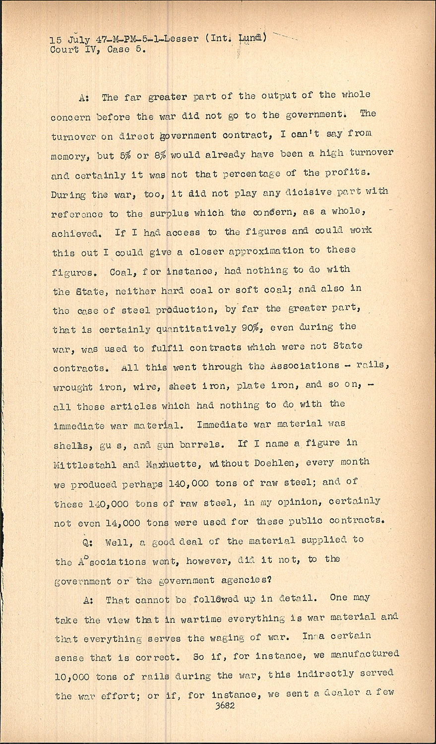 A:The far greater part of the output of the whole concern before the war did not go to the government. The turnover on direct government contract, I can't say from memory, but 5% or 8% would already have been a high turnover and certainly it was not that percentage of the profits. During the war, too, it did not play any dicisive part with reference to the surplus which the concern, as a whole, achieved. If I had access to the figures and could work this out I could give a closer approximation to these figures. Coal, for instance, had nothing to do with the State, neither hard coal or soft coal; and also in the case of steel production, by far the greater part, that is certainly quantitatively 90%, even during the war, was used to fulfil contracts which were not State contracts. All this went through the Associations - rails, wrought iron, wire, sheet iron, plate iron, and so on, all these articles which had nothing to do with the immediate war material. Immediate war material was shells, gu s, and gun barrels. If I name a figure in Mittlestahl and Maxhuette, without Doehlen, every month we produced perhaps 140,000 tons of raw steel; and of these 140,000 tons of raw steel, in my opinion, certainly not even 14,000 tons were used for these public contracts.