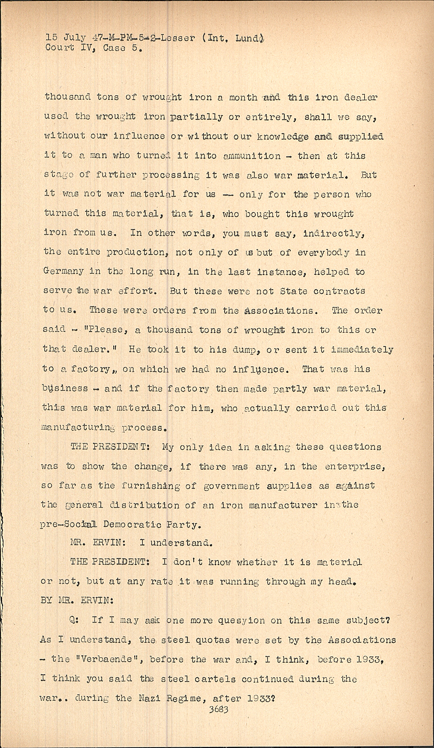 But it was not war material for us -- only for the person who turned this material, that is, who bought this wrought iron from us. In other words, you must say, indirectly, the entire production, not only of us but of everybody in Germany in the long run, in the last instance, helped to serve the war effort. But these were not State contracts to us. These were orders from the Associations. The order said - "Please, a thousand tons of wrought iron to this or that dealer." He took it to his dump, or sent it immediately to a factory, on which we had no influence. That was his business - and if the factory then made partly war material, this was war material for him, who actually carried out this manufacturing process.