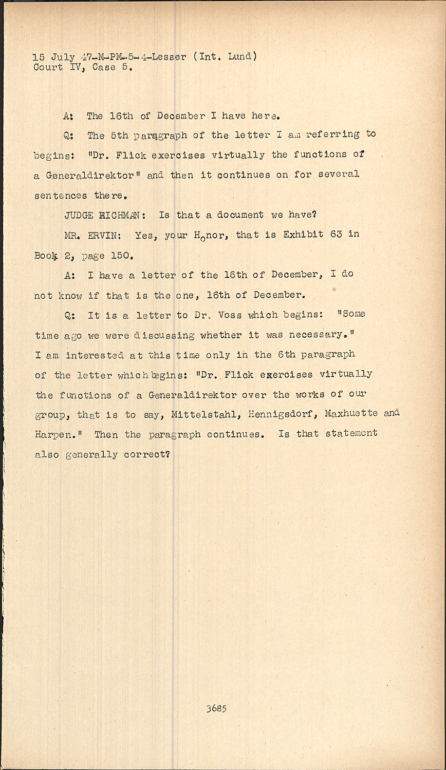 Q:It is a letter to Dr. Voss which begins: "Some time ago we were discussing whether it was necessary." I am interested at this time only in the 6th paragraph of the letter which begins: "Dr. Flick exercises virtually the functions of a Generaldirektor over the works of our group, that is to say, Mittelstahl, Hennigsdorf, Maxhuette and Harpen." Then the paragraph continues. Is that statement also generally correct?