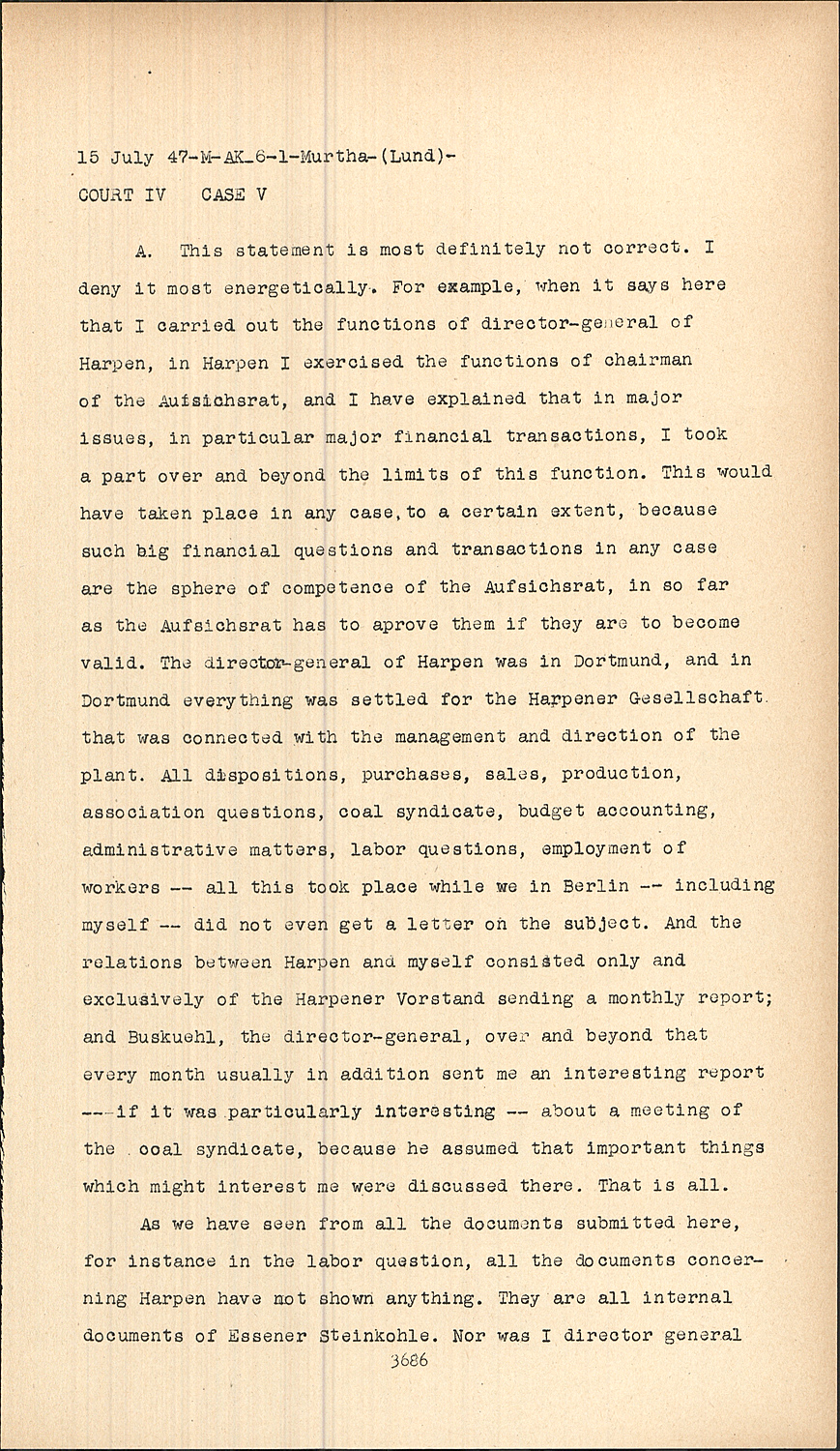 As we have seen from all the documents submitted here, for instance in the labor question, all the documents concerning Harpen have not shown anything. They are all internal documents of Essener Steinkohle. Nor was I director general of Harpen.