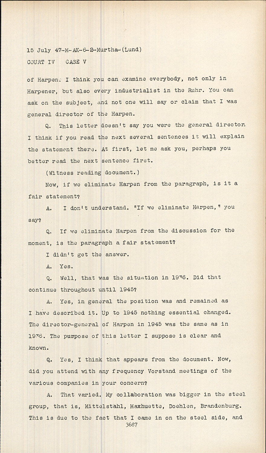 A.Yes, in general the position was and remained as I have described it. Up to 1945 nothing essential changed. The director-general of Harpen in 1945 was the same as in 1936. The purpose of this letter I suppose is clear and known.