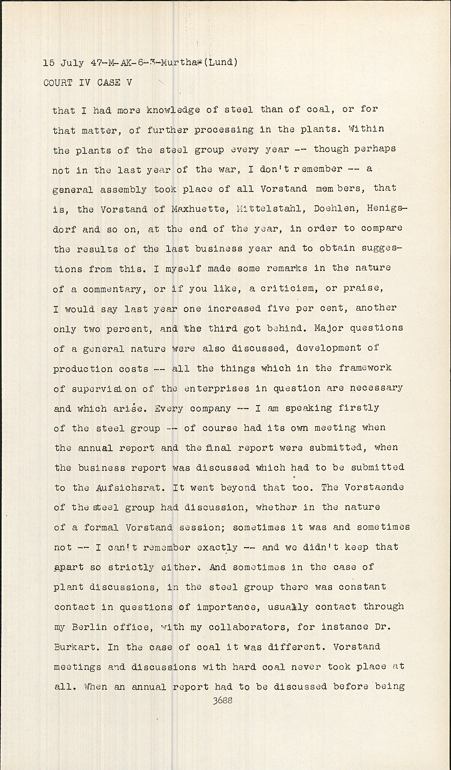 A.That varied. My collaboration was bigger in the steel group, that is, Mittelstahl, Maxhuette, Doehlen, Brandenburg. This is due to the fact that I came in on the steel side, and that I had more knowledge of steel than of coal, or for that matter, of further processing in the plants.