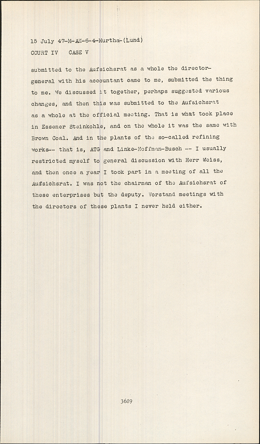 We discussed it together, perhaps suggested various changes, and then this was submitted to the Aufsichsrat as a whole at the official meeting. That is what took place in Essener Steinkohle, and on the whole it was the same with Brown Coal. And in the plants of the so-called refining works-- that is, ATG and Linke-Hoffman-Busch -- I usually restricted myself to general discussion with Herr Weiss, and then once a year I took part in a meeting of all the Aufsichsrat. I was not the chairman of the Aufsichsrat of these enterprises but the deputy. Vorstand meetings with the directors of these plants I never held either.
