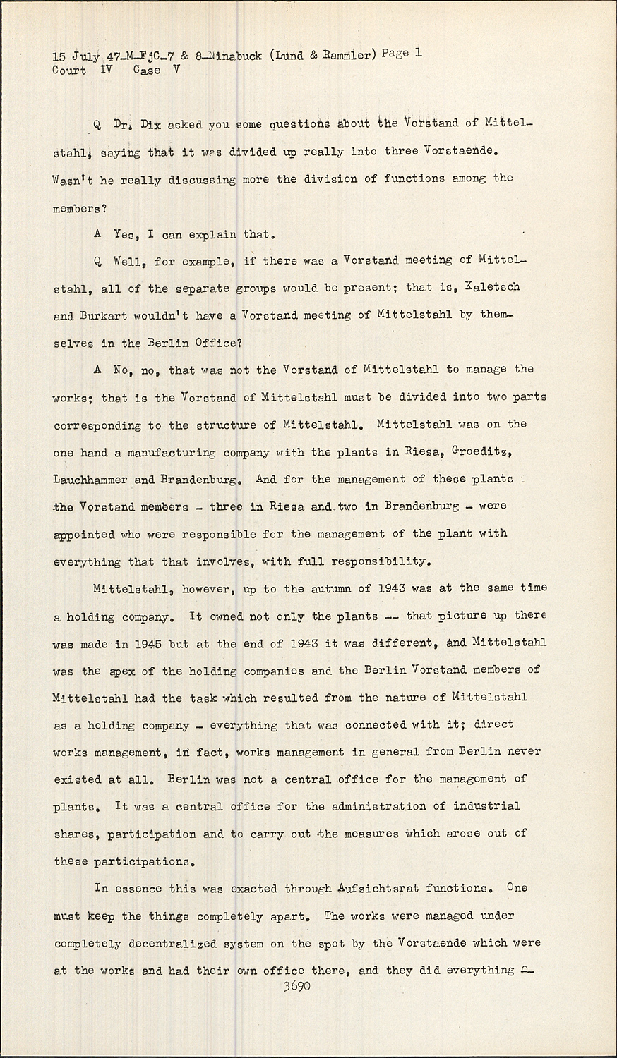 ANo, no, that was not the Vorstand of Mittelstahl to manage the works; that is the Vorstand of Mittelstahl must be divided into two parts corresponding to the structure of Mittelstahl. Mittelstahl was on the one hand a manufacturing company with the plants in Riesa, Groeditz, Lauchhammer and Brandenburg. And for the management of these plants the Vorstand members - three in Riesa and two in Brandenburg - were appointed who were responsible for the management of the plant with everything that that involves, with full responsibility.