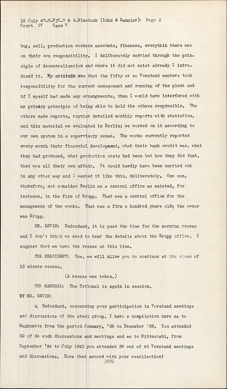 QDefendant, concerning your participation in Vorstand meetings and discussions of the steel group, I have a compilation here as to Maxhuette from the period January, '36 to December '38. You attended 32 of 34 such discussions and meetings and as to Mittestahl, from September '34 to July 1940 you attended 36 out of 40 Vorstand meetings and discussions. Does that accord with your recollection?