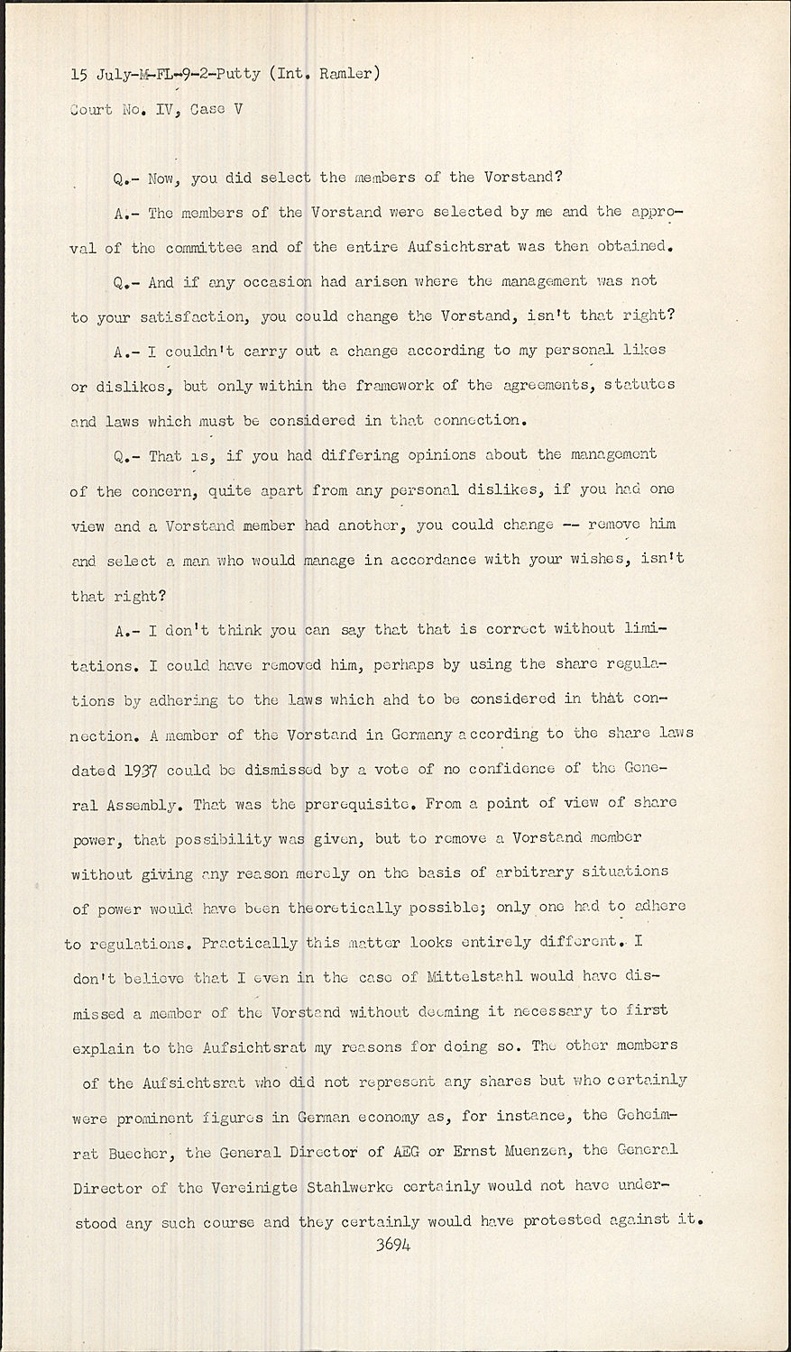 Q.- That is, if you had differing opinions about the management of the concern, quite apart from any personal dislikes, if you had one view and a Vorstand member had another, you could change -- remove him and select a man who would manage in accordance with your wishes, isn't that right?