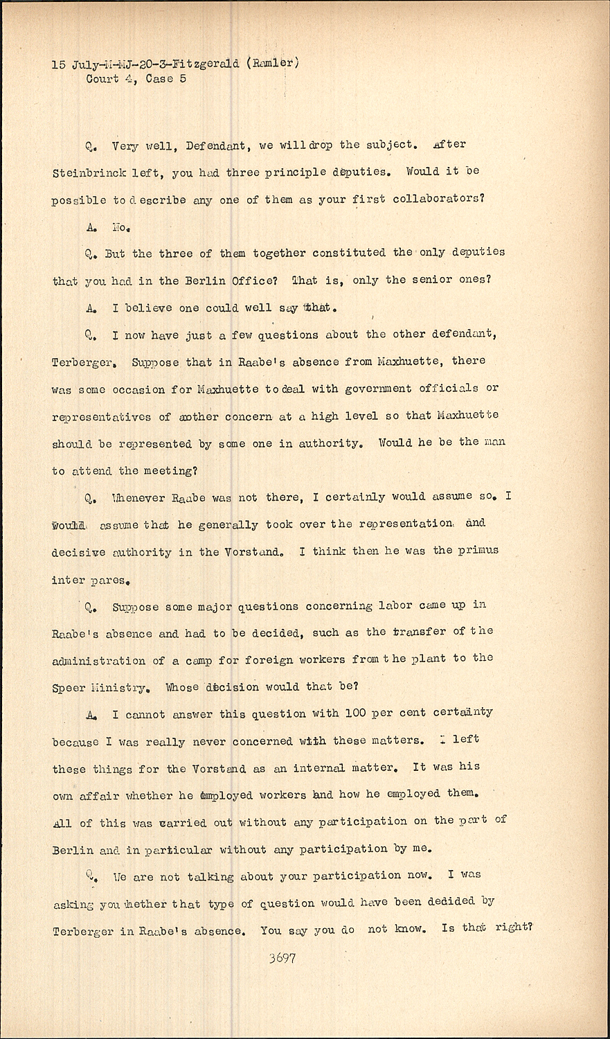 Q.We are not talking about your participation now. I was asking you whether that type of question would have been decided by Terberger in Raabe's absence. You say you do not know. Is that right?
