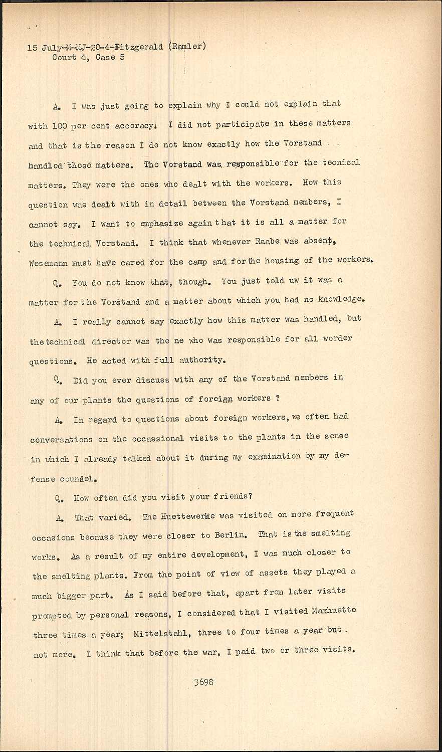 A.In regard to questions about foreign workers, we often had conversations on the occassional visits to the plants in the sense in which I already talked about it during my examination by my defense counsel.