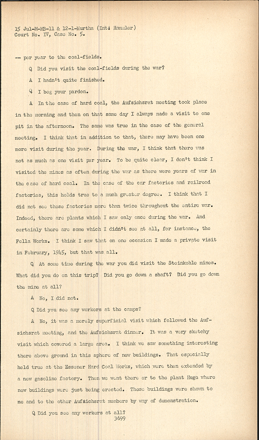 AIn the case of hard coal, the Aufsichsrat meeting took place in the morning and then on that same day I always made a visit to one pit in the afternoon. The same was true in the case of the general meeting. I think that in addition to that, there may have been one more visit during the year. During the war, I think that there was not as much as one visit per year. To be quite clear, I don't think I visited the mines as often during the war as there were years of war in the case of hard coal. In the case of the car factories and railroad factories, this holds true to a much greater degree. I think that I did not see these factories more than twice throughout the entire war. Indeed, there are plants which I saw only once during the war. And certainly there are some which I didn't see at all, for instance, the Fella Works. I think I saw that on one occasion I made a private visit in February, 1945, but that was all.