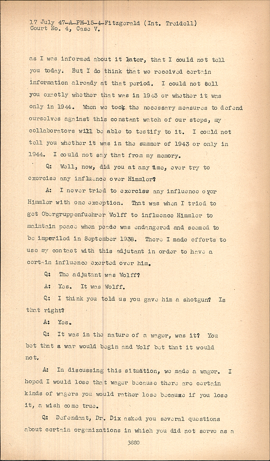 A:I never tried to exercise any influence o ver Himmler with one exception. That was when I tried to get Obergruppenfuehrer Wolff to influence Himmler to maintain peace when peace was endangered and seemed to be imperiled in September 1938. There I made efforts to use my contact with this adjutant in order to have a certain influence exerted over him.