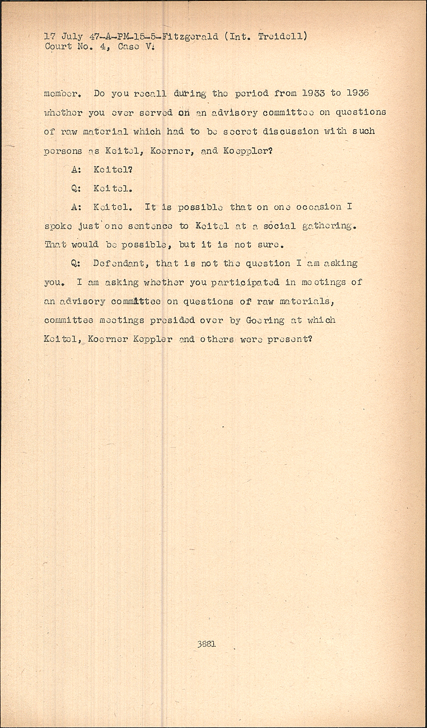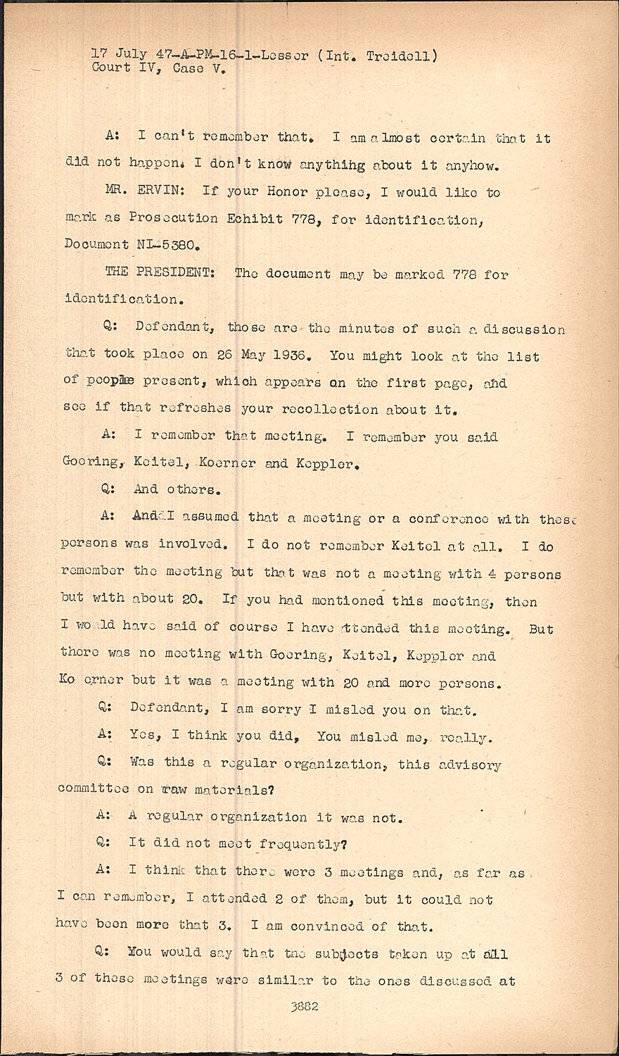 Q:Defendant, that is not the question I am asking you. I am asking whether you participated in meetings of an advisory committee on questions of raw materials, committee meetings presided over by Goering at which Keitel, Koerner Keppler and others were present?