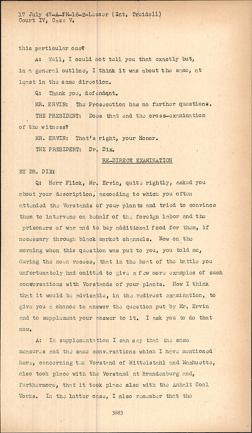 Q:Herr Flick, Mr. Ervin, quite rightly, asked you about your description, accocding to which you often attended the Vorstands of your plants and tried to convince them to intervene on behalf of the foreign labor and the prisoners of war and to buy additional food for them, if necessary through black market channels. Now on the morning when this question was put to you, you told me, during the noon recess, that in the heat of the battle you unfortunately had omitted to give a few more examples of such conversations with Vorstands of your plants. Now I think that it would be advisable, in the redirect examination, to give you a chance to answer the question put by Mr. Ervin and to supplement your answer to it. I ask you to do that now.