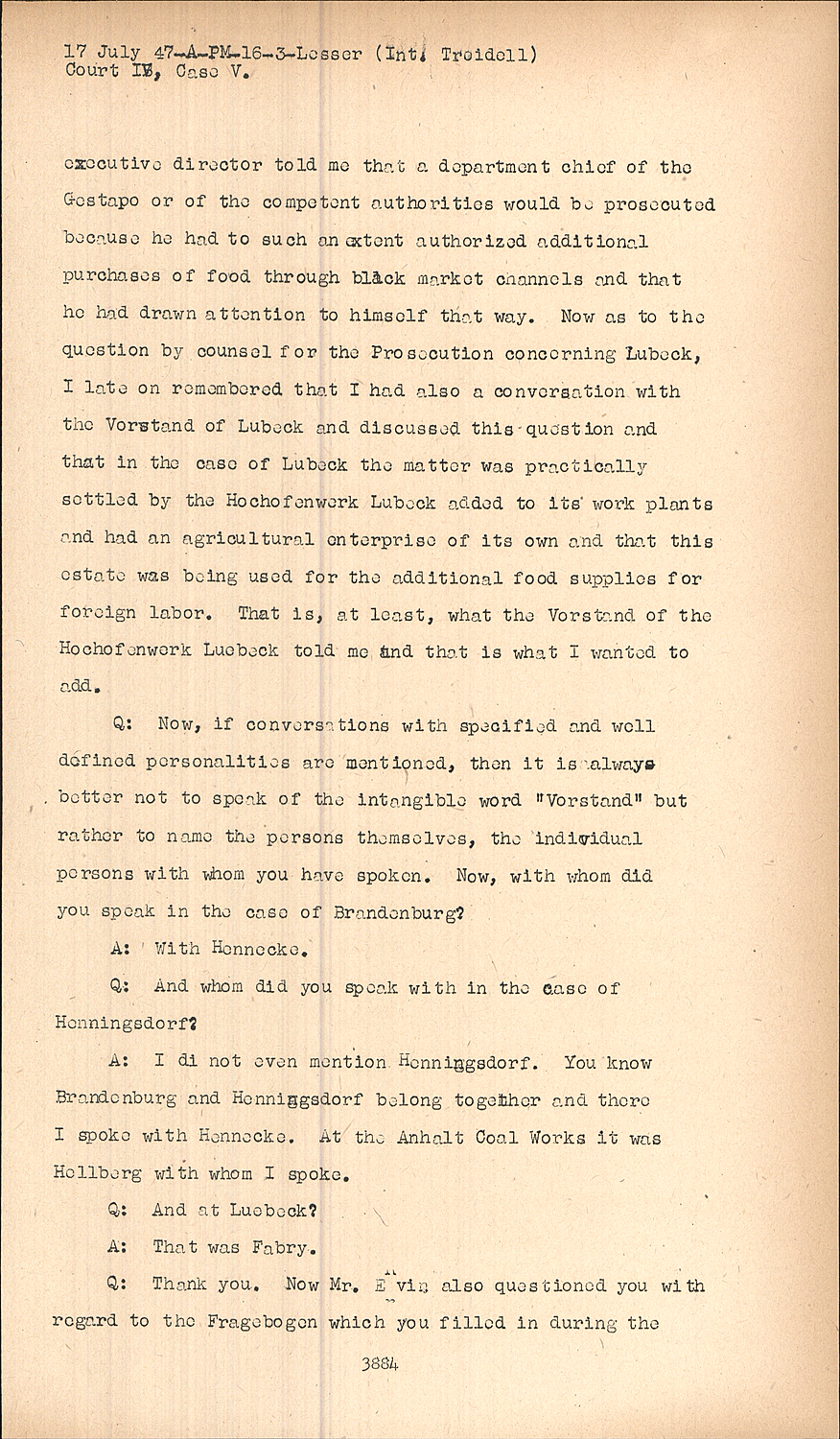 A:In supplementation I can say that the same measures and the same conversations which I have mentioned here, concerning the Vorstand of Mittelstahl and Maxhuette, also took place with the Vorstand at Brandenburg and, furthermore, that it took place also with the Anhalt Coal Works. In the latter case, I also remember that the executive director told me that a department chief of the Gestapo or of the competent authorities would be prosecuted because he had to such an extent authorized additional purchases of food through black market channels and that he had drawn attention to himself that way.
