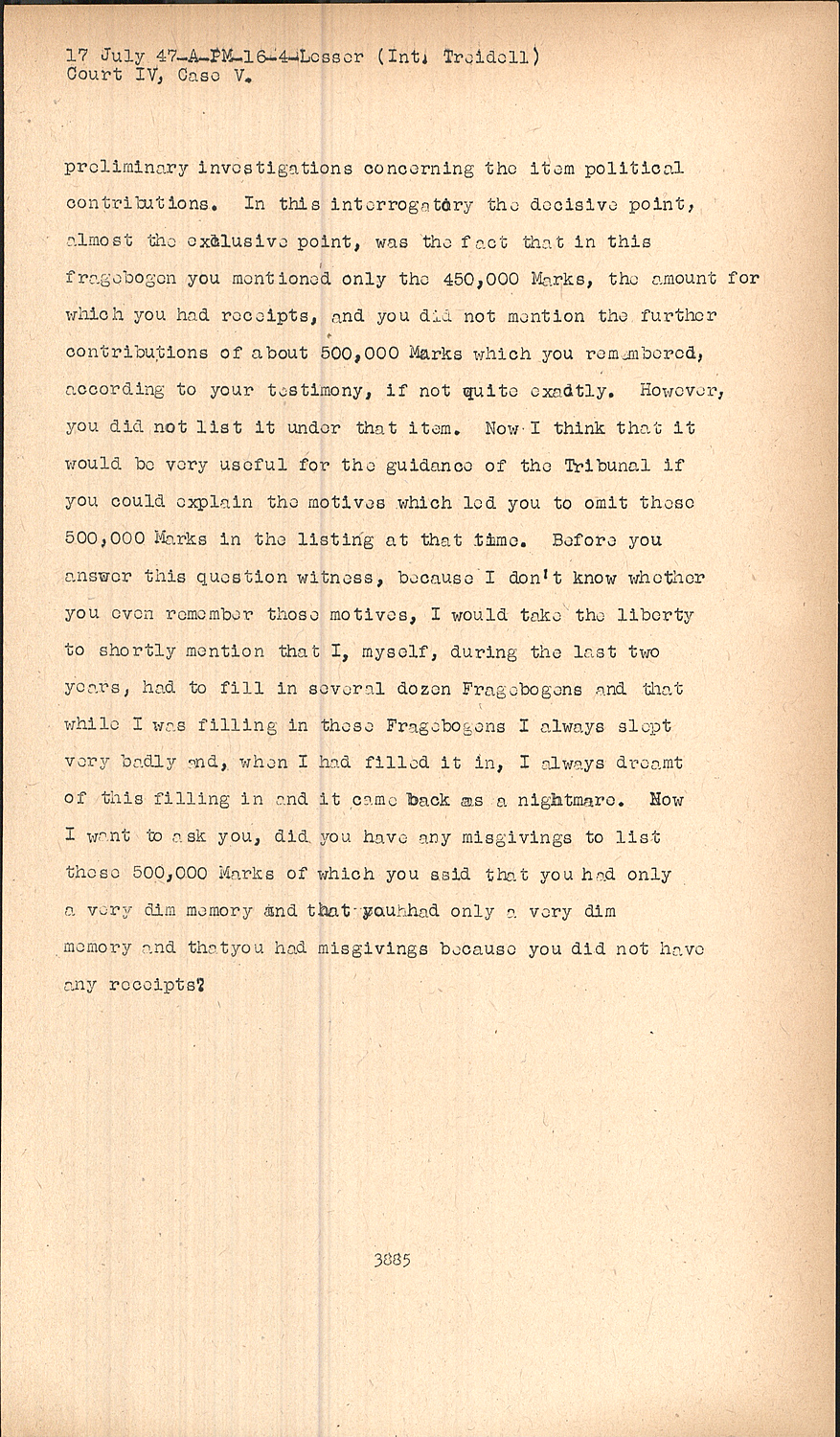 In this interrogatory the decisive point, almost the exclusive point, was the fact that in this fragebogen you mentioned only the 450,000 Marks, the amount for which you had receipts, and you did not mention the further contributions of about 500,000 Marks which you remembered, according to your testimony, if not quite exactly. However, you did not list it under that item. Now I think that it would be very useful for the guidance of the Tribunal if you could explain the motives which led you to omit these 500,000 Marks in the listing at that time. Before you answer this question witness, because I don't know whether you even remember those motives, I would take the liberty to shortly mention that I, myself, during the last two years, had to fill in several dozen Fragebogens and that while I was filling in these Fragebogens I always slept very badly and, when I had filled it in, I always dreamt of this filling in and it came back as a nightmare. Now I want to ask you, did you have any misgivings to list these 500,000 Marks of which you said that you had only a very dim memory and that you had only a very dim memory and thatyou had misgivings because you did not have any receipts?