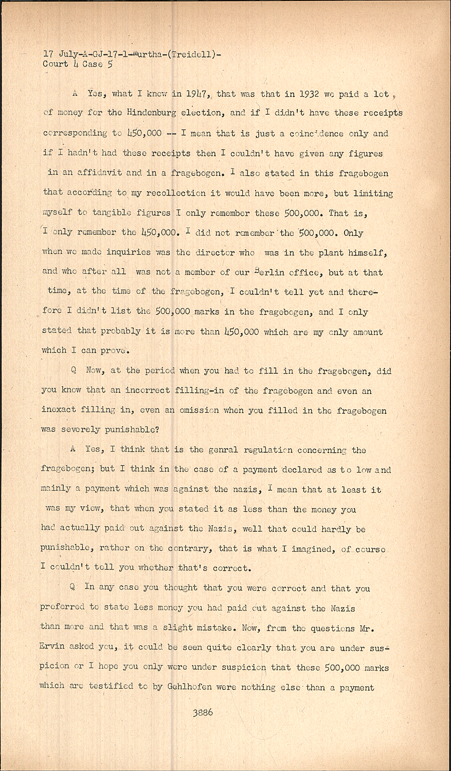 QIn any case you thought that you were correct and that you preferred to state less money you had paid out against the Nazis than more and that was a slight mistake. Now, from the questions Mr. Ervin asked you, it could be seen quite clearly that you are under suspicion or I hope you only were under suspicion that these 500,000 marks which are testified to by Gehlhofen were nothing else than a payment corresponding to the 450,000 marks which you previously had paid and therefore I would like to ask you the direct question.