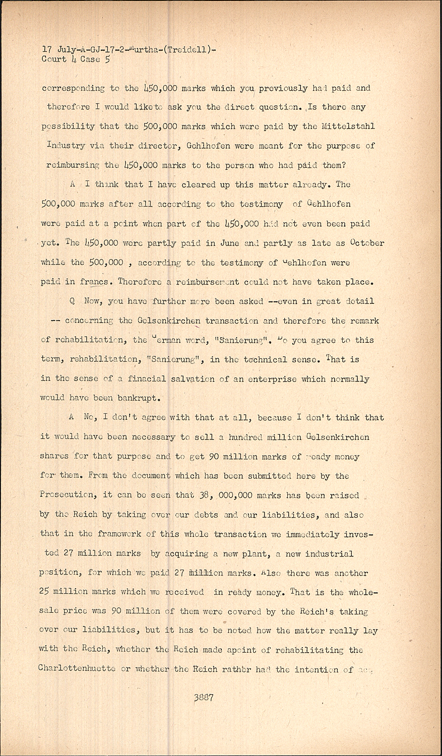 AI think that I have cleared up this matter already. The 500,000 marks after all according to the testimony of Gehlhofen were paid at a point when part of the 450,000 had not even been paid yet. The 450,000 were partly paid in June and partly as late as October while the 500,000 , according to the testimony of Gehlhofen were paid in francs. Therefore a reimbursement could not have taken place.