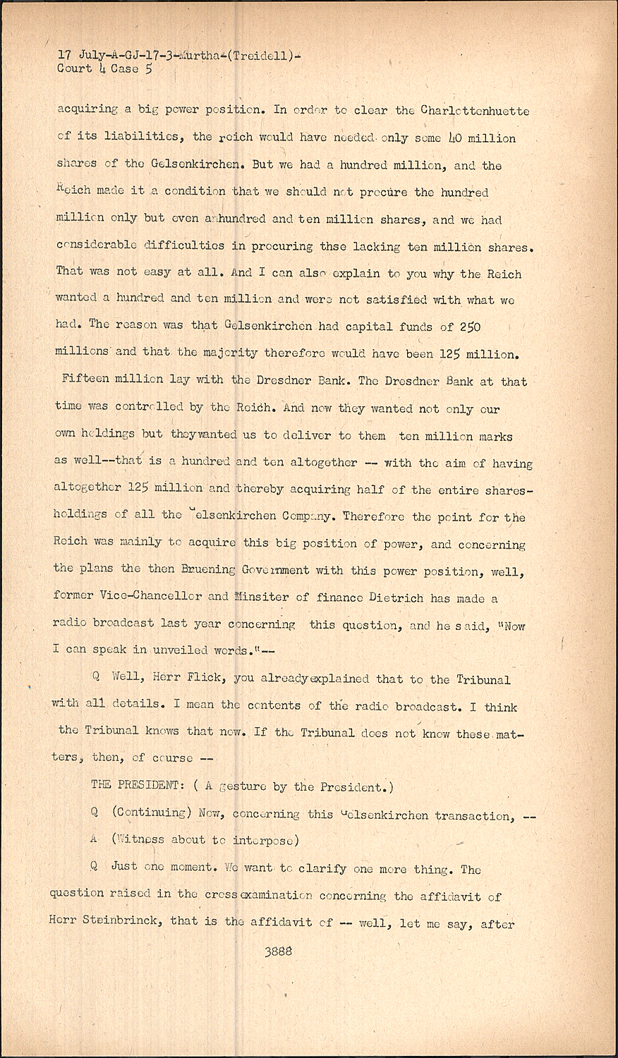 Fifteen million lay with the Dresdner Bank. The Dresdner Bank at that time was controlled by the Reich. And now they wanted not only our own holdings but theywanted us to deliver to them ten million marks as well--that is a hundred and ten altogether -- with the aim of having altogether 125 million and thereby acquiring half of the entire sharesholdings of all the Gelsenkirchen Company. Therefore the point for the Reich was mainly to acquire this big position of power, and concerning the plans the then Bruening Government with this power position, well, former Vice-Chancellor and Minsiter of finance Dietrich has made a radio broadcast last year concerning this question, and he said, "Now I can speak in unveiled words."-