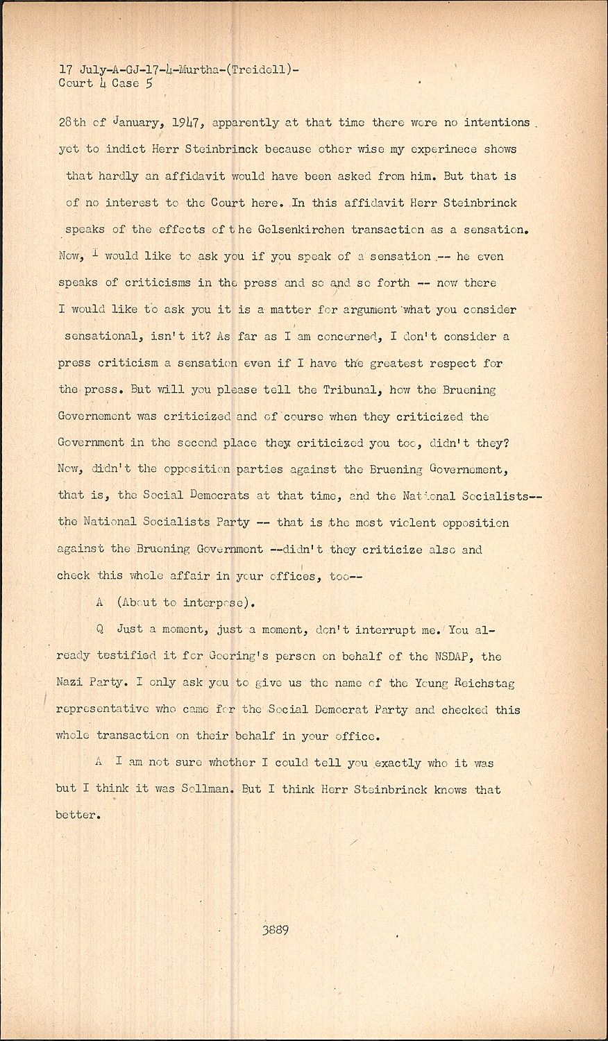 QJust a moment, just a moment, don't interrupt me. You already testified it for Goering's person on behalf of the NSDAP, the Nazi Party. I only ask you to give us the name of the Young Reichstag representative who came for the Social Democrat Party and checked this whole transaction on their behalf in your office.