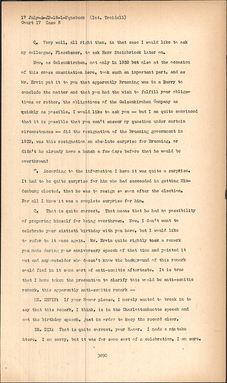Now, as Gelsenkirchen, not only in 1932 but also at the occasion of this cross examination here, took such an important part, and as Mr. Ervin put it to you that apparently Bruening was in a hurry to conclude the matter and that you had the wish to fulfill your obligations or rather, the obligations of the Gelsenkirchen Company as quickly as possible, I would like to ask you -- but I am quite convinced that it is possible that you can't answer my question under certain circamstances -- did the resignation of the Bruening government in 1932, was this resignation an absolute surprise for Bruening, or didn't he already have a hunch a few days before that he would be overthrown?