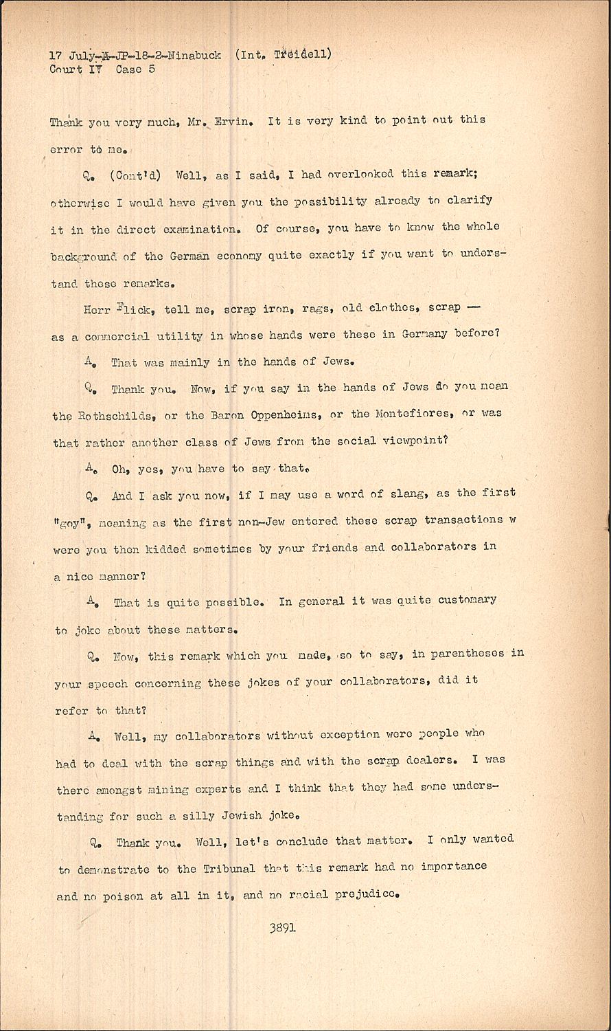 Q. (Cont'd) Well, as I said, I had overlooked this remark; otherwise I would have given you the possibility already to clarify it in the direct examination. Of course, you have to know the whole background of the German economy quite exactly if you want to understand these remarks. Herr Flick, tell me, scrap iron, rags, old clothes, scrap -as a commercial utility in whose hands were these in Germany before?