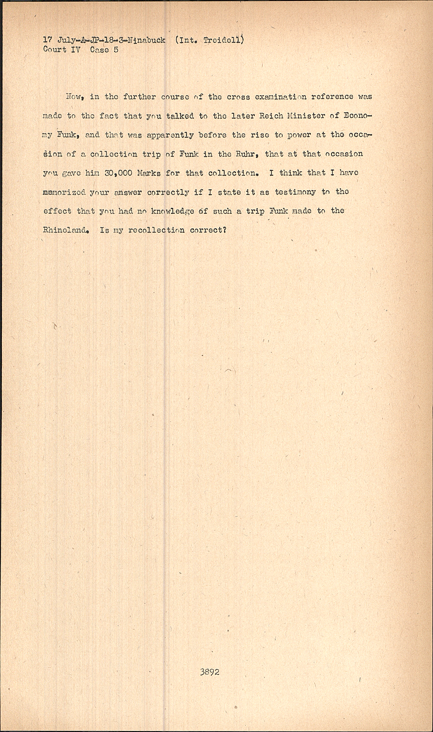 Now, in the further course of the cross examination reference was made to the fact that you talked to the later Reich Minister of Economy Funk, and that was apparently before the rise to power at the occasion of a collection trip of Funk in the Ruhr, that at that occasion you gave him 30,000 Marks for that collection. I think that I have memorized your answer correctly if I state it as testimony to the effect that you had no knowledge of such a trip Funk made to the Rhineland. Is my recollection correct?