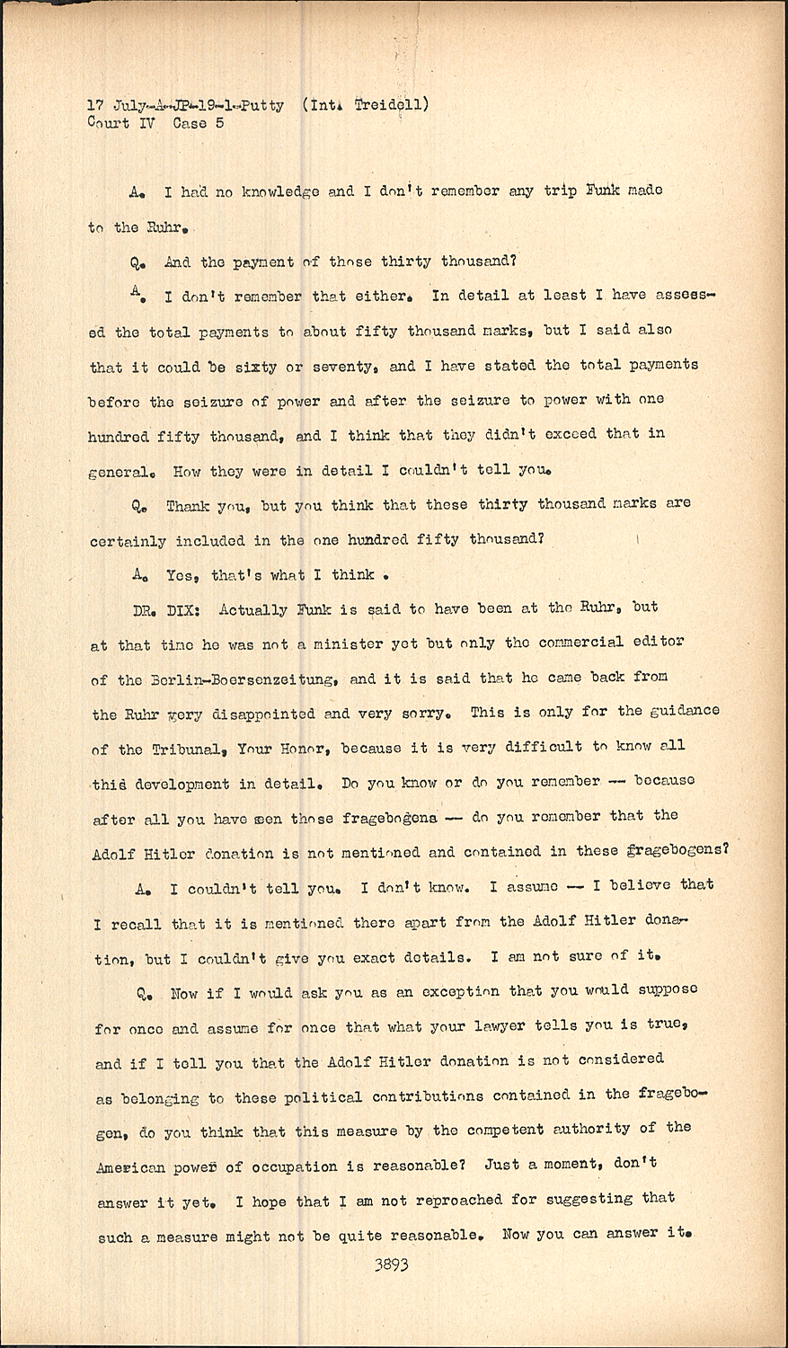DR. DIX:Actually Funk is said to have been at the Ruhr, but at that time he was not a minister yet but only the commercial editor of the Berlin-Boersenzeitung, and it is said that he came back from the Ruhr very disappointed and very sorry. This is only for the guidance of the Tribunal, Your Honor, because it is very difficult to know all this development in detail. Do you know or do you remember -- because after all you have seen those fragebogens -- do you remember that the Adolf Hitler donation is not mentioned and contained in these fragebogens?