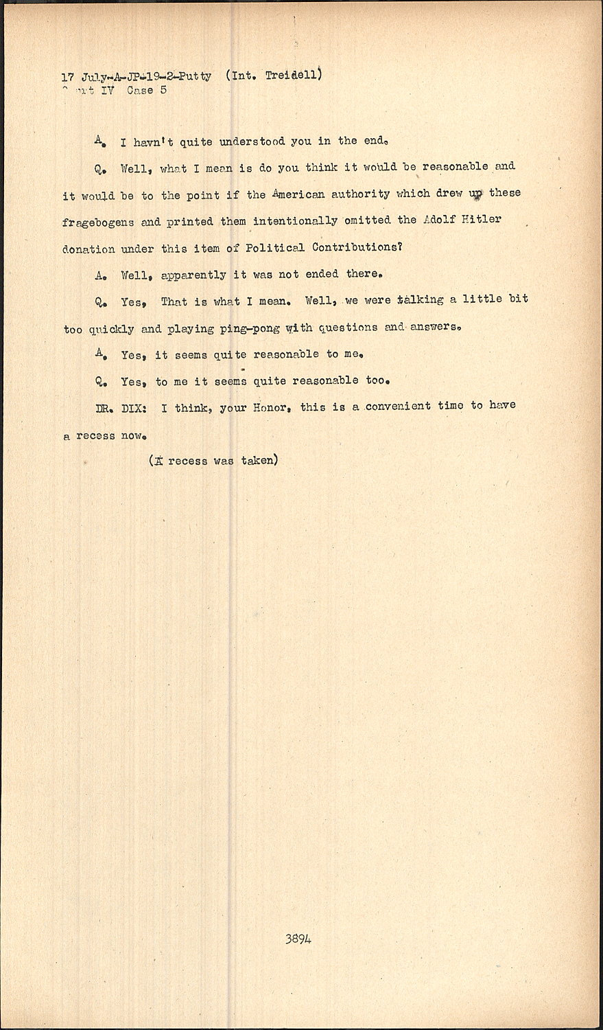 Q.Well, what I mean is do you think it would be reasonable and it would be to the point if the American authority which drew up these fragebogens and printed them intentionally omitted the Adolf Hitler donation under this item of Political Contributions?