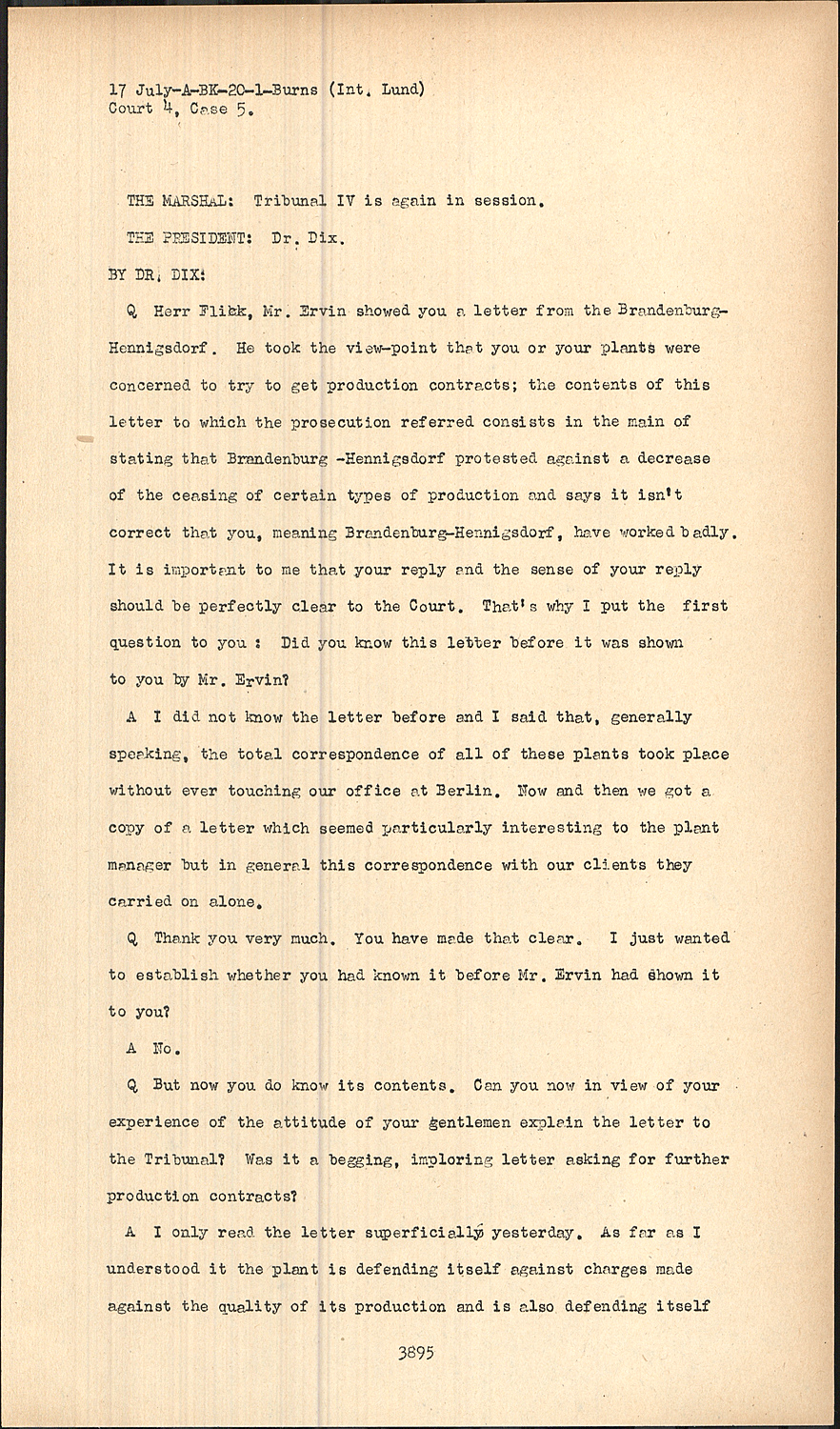 QHerr Flick, Mr. Ervin showed you a letter from the BrandenburgHennigsdorf. He took the viewpoint that you or your plants were concerned to try to get production contracts; the contents of this letter to which the prosecution referred consists in the main of stating that Brandenburg -Hennigsdorf protested against a decrease of the ceasing of certain types of production and says it isn't correct that you, meaning Brandenburg-Hennigsdorf, have worked badly. It is important to me that your reply and the sense of your reply should be perfectly clear to the Court. That's why I put the first question to you : Did you know this letter before it was shown to you by Mr. Ervin?
