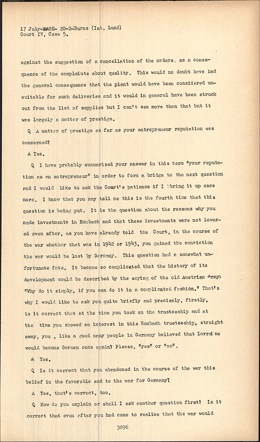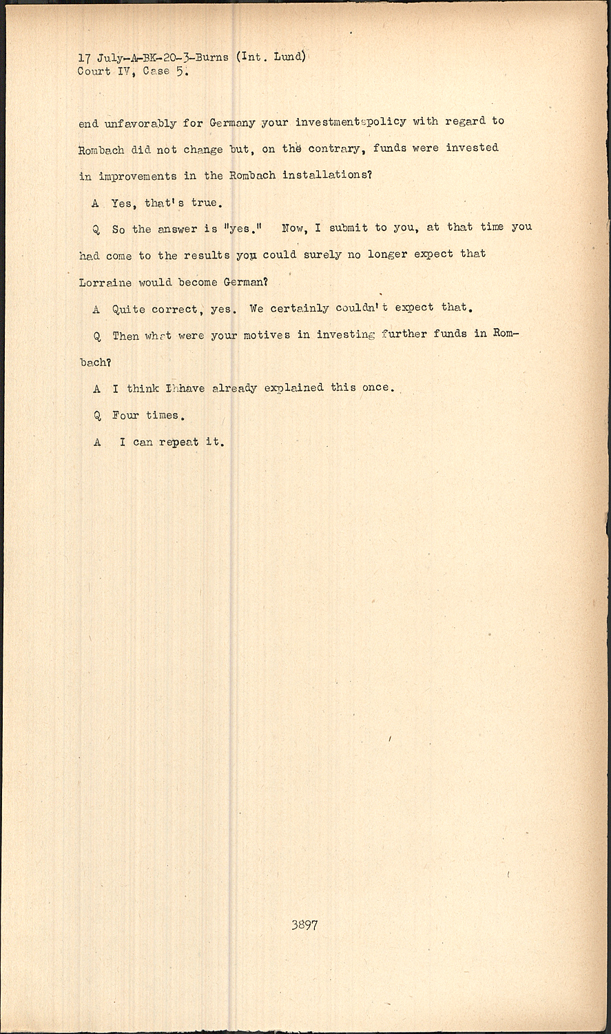 QI have probably summarized your answer in this term "your reputation as an entrepreneur" in order to form a bridge to the next question and I would like to ask the Court's patience if I bring it up once more. I know that you may tell me this is the fourth time that this question is being put. It is the question about the reasons why you made investments in Rombach and that these investments were not lowered even after, as you have already told the Court, in the course of the war whether that was in 1942 or 1943, you gained the conviction the war would be lost by Germany. This question had a somewhat unfortunate fate. It became so complicated that the history of its development could be described by the saying of the old Austrian Army: "Why do it simply, if you can do it in a complicated fashion." That's why I would like to ask you quite briefly and precisely, firstly, is it correct that at the time you took on the trusteeship and at the time you showed an interest in this Rombach trusteeship, straight away, you , like a good many people in Germany believed that Lorraine would become German once again? Please, "yes" or "no".