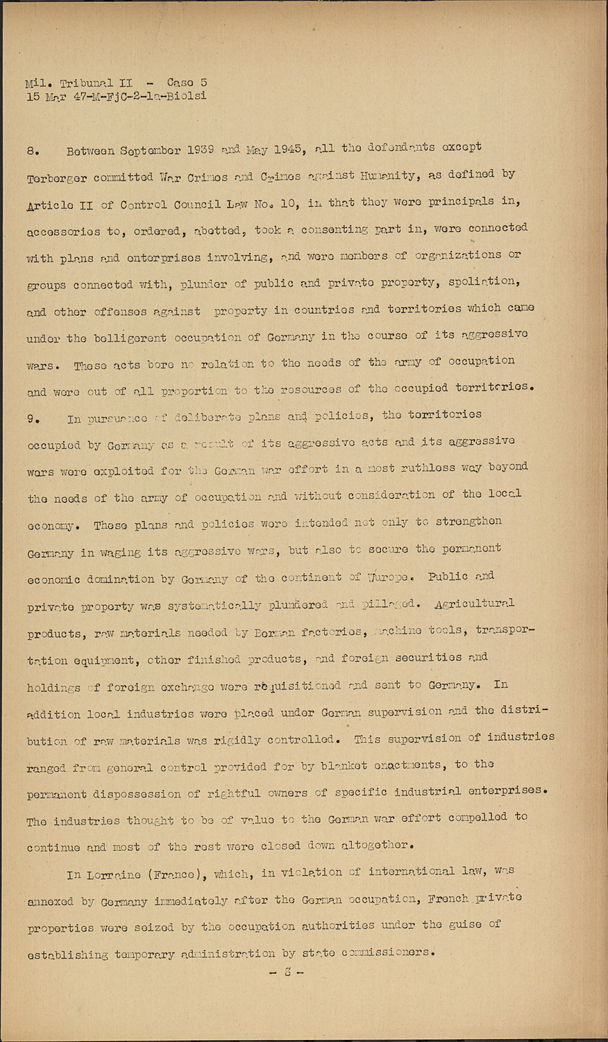 Mil. Tribunal II - Case 5 8. Between September 1939 and May 1945, all the defendants except Terberger committed war crimes and crimes against Humanity, as defined byArticle II of control council Law No. 10, in that they were principals in, accessories to, ordered, abotted, took a consenting part in, were connected with plans and enterprises involving, and were members of organizations or groups connected with, plunder of public and private property, spoliation, and other offenses against property in countries and territories which came under the belligerent occupation of Germany in the course of its aggressive wars. These acts bore no relation to the needs of the army of occupation and were out of all proportion to the resources of the occupied territories. 9. In pursuance of deliberate plans and policies, the territories occupied by Germany as result of its aggressive acts and its aggressive wars were exploited for the German war effort in a most ruthless way beyond the needs of the army of occupation and without consideration of the local economy. These plans and policies were intended net only to strengthen Germany in waging its a aggressive wars, but rise to secure the permanent economic domination by Germany of the continent of Europe. Public and private property was systematically plundered and pillaged. Agricultural products, raw materials needed by Berman factories, Machine tools, transportation equipment, other finished products, and foreign securities and holdings of foreign exchange were requisitioned and sent to Germany. In addition local industries were placed under German supervision and the distribution of raw materials was rigidly controlled. This supervision of industries ranged from general control provided for by blanket enactments, to the permanent dispossession of rightful owners of specific industrial enterprises. The industries thought to be of value to the German war effort compelled to continue and most of the rest were closed down altogether.