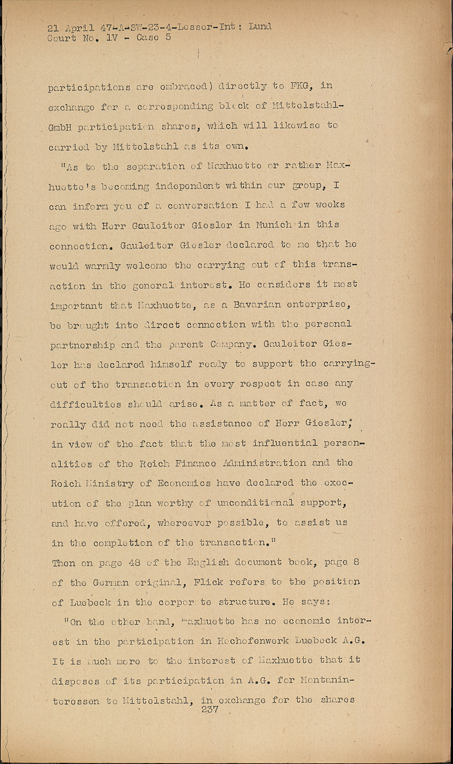 "As to the separation of Maxhuette or rather Maxhuette's becoming independent within our group, I can inform you of a conversation I had a few weeks ago with Herr Gauleiter Giesler in Munich in this connection. Gauleiter Giesler declared to me that he would warmly welcome the carrying out of this transaction in the general interest. He considers it most important that Maxhuette, as a Bavarian enterprise, be brought into direct connection with the personal partnership and the parent Company. Gauleiter Giesler has declared himself ready to support the carryingout of the transaction in every respect in case any difficulties should arise. As a matter of fact, we really did not need the assistance of Herr Giesler; in view of the fact that the most influential personalities of the Reich Finance Administration and the Reich Ministry of Economics have declared the execution of the plan worthy of unconditional support, and have offered, whereever possible, to assist us in the completion of the transaction." Then on page 43 of the English document book, page 8 of the German original, Flick refers to the position of Luebeck in the corporate structure. He says: