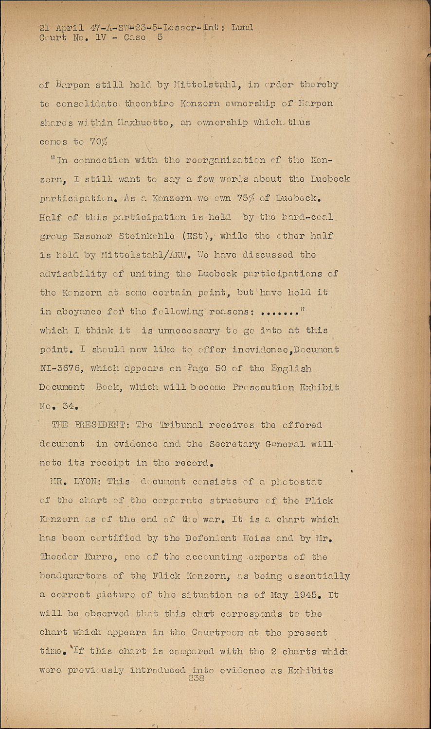 MR. LYON:This document consists of a photostat of the chart of the corporate structure of the Flick Konzern as of the end of the war. It is a chart which has been certified by the Defendant Weiss and by Mr. Theoder Kurre, one of the accounting experts of the headquarters of the Flick Konzern, as being essentially a correct picture of the situation as of May 1945. It will be observed that this chart corresponds to the chart which appears in the Courtroom at the present time. If this chart is compared with the 2 charts which were previously introduced into evidence as Exhibits No. 31 and No. 32, it will be observed that the process of diffusion of the various companies, so that they all stem directly from the Friedrich Flick Kommanditgesellschaft, has been carried still further so that virtually all of the principle companies are held directly by the Friedrich Flick Kommanditgesellschaft, whith the sole exception that in some instances there is an intermediate holding company which has no other function.