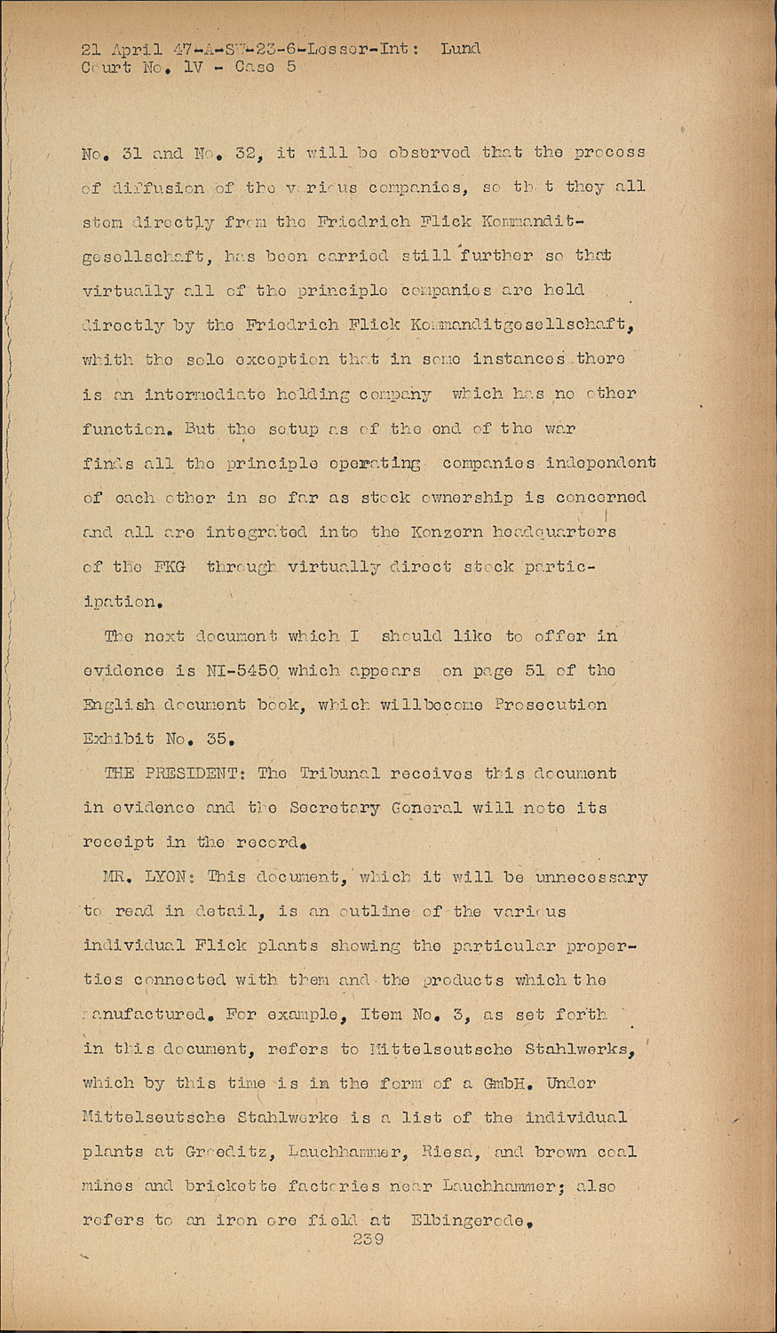 MR. LYON:This document, which it will be unnecessary to read in detail, is an outline of the various individual Flick plants showing the particular properties connected with them and the products which the manufactured. For example, Item No. 3, as set forth in this document, refers to Mittelseutsche Stahlwerks, which by this time is in the form of a GmbH. Under Mittelseutsche Stahlwerke is a list of the individual plants at Groeditz, Lauchhammer, Riesa, and brown coal mines and brickette factories near Lauchhammer; also refers to an iron ore field at Elbingerode.