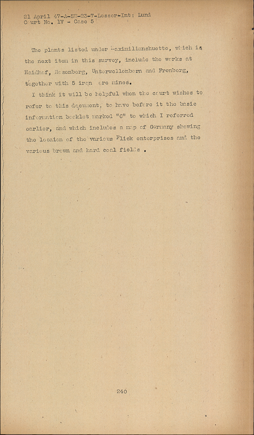 I think it will be helpful when the court wishes to refer to this document, to have before it the basic information booklet marked "C" to which I referred earlier, and which includes a map of Germany showing the locaion of the various Flick enterprises and the various brown and hard coal fields.