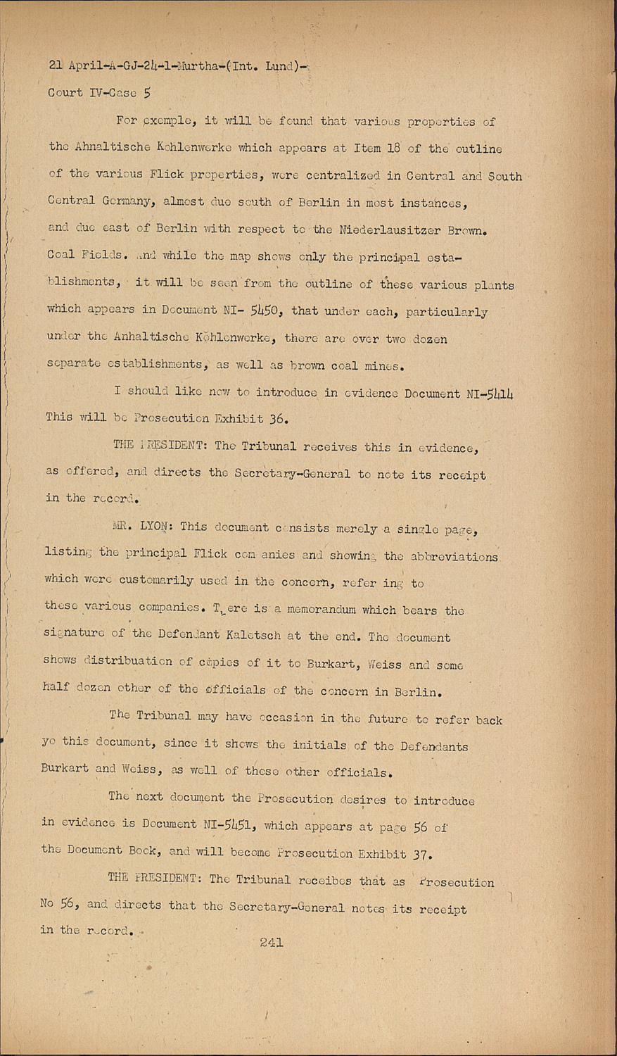 The next document the Prosecution desires to introduce in evidence is Document NI-5451 which appears at page 56 of the Document Book, and will become Prosecution Exhibit 37.