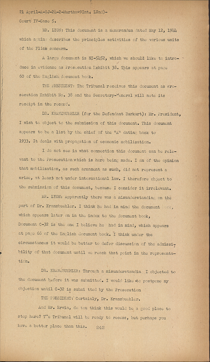DR. KRANZBUEHLER:Through a misunderstanding I objected to the document before it was submitted. I would like to postpone my objection until C-32 is submitted by the Prosecution